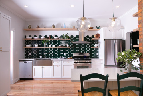 So, you can paint the backdrop wall and cabinets in SW Pure White and add the hexagonal-shaped dark green tiles to add a visual character.