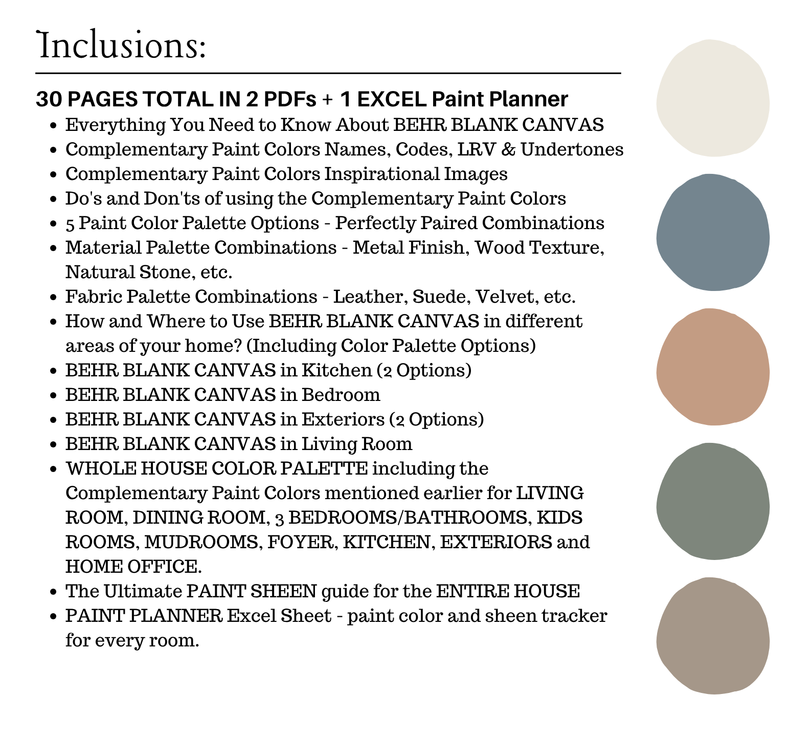 The PDF contains EVERYTHING you need to KNOW about Behr BLANK CANVAS! It includes a list of complementary Behr Paint Colors that can be used to pair with Behr BLANK CANVAS . This is a PREPACKAGED Color Palette Selection Listing that includes the Behr BLANK CANVAS color recommendations for walls, ceilings, trims, moldings, doors, and window frames – for your WHOLE HOUSE.