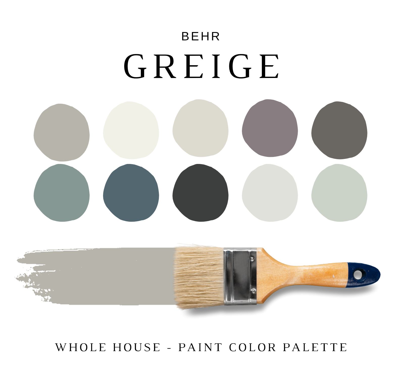 The PDF contains EVERYTHING you need to KNOW about Behr GREIGE! It includes a list of complementary Behr Paint Colors that can be used to pair with Behr GREIGE. This is a PREPACKAGED Color Palette Selection Listing that includes the Behr GREIGE color recommendations for walls, ceilings, trims, moldings, doors, and window frames – for your WHOLE HOUSE.