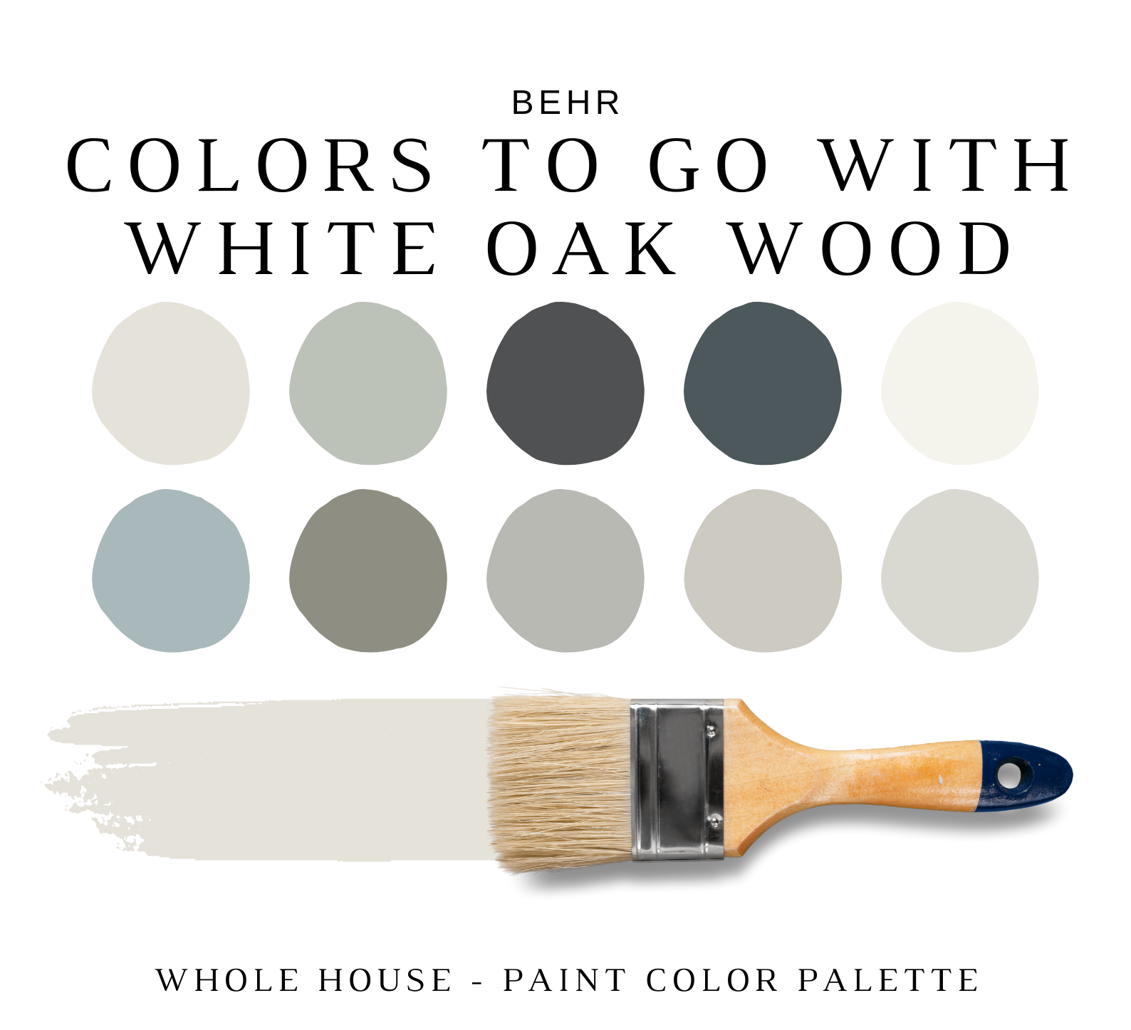 The PDF contains EVERYTHING you need to KNOW about Behr Paint Colors That Go With WHITE OAK! It includes a list of 10 complementary Behr Paint Colors That Go With WHITE OAK. This is a PREPACKAGED Behr Yellow Oak Color Palette Selection Listing that includes the Behr complementary color recommendations for walls, ceilings, trims, moldings, doors, and window frames – for your WHOLE HOUSE.