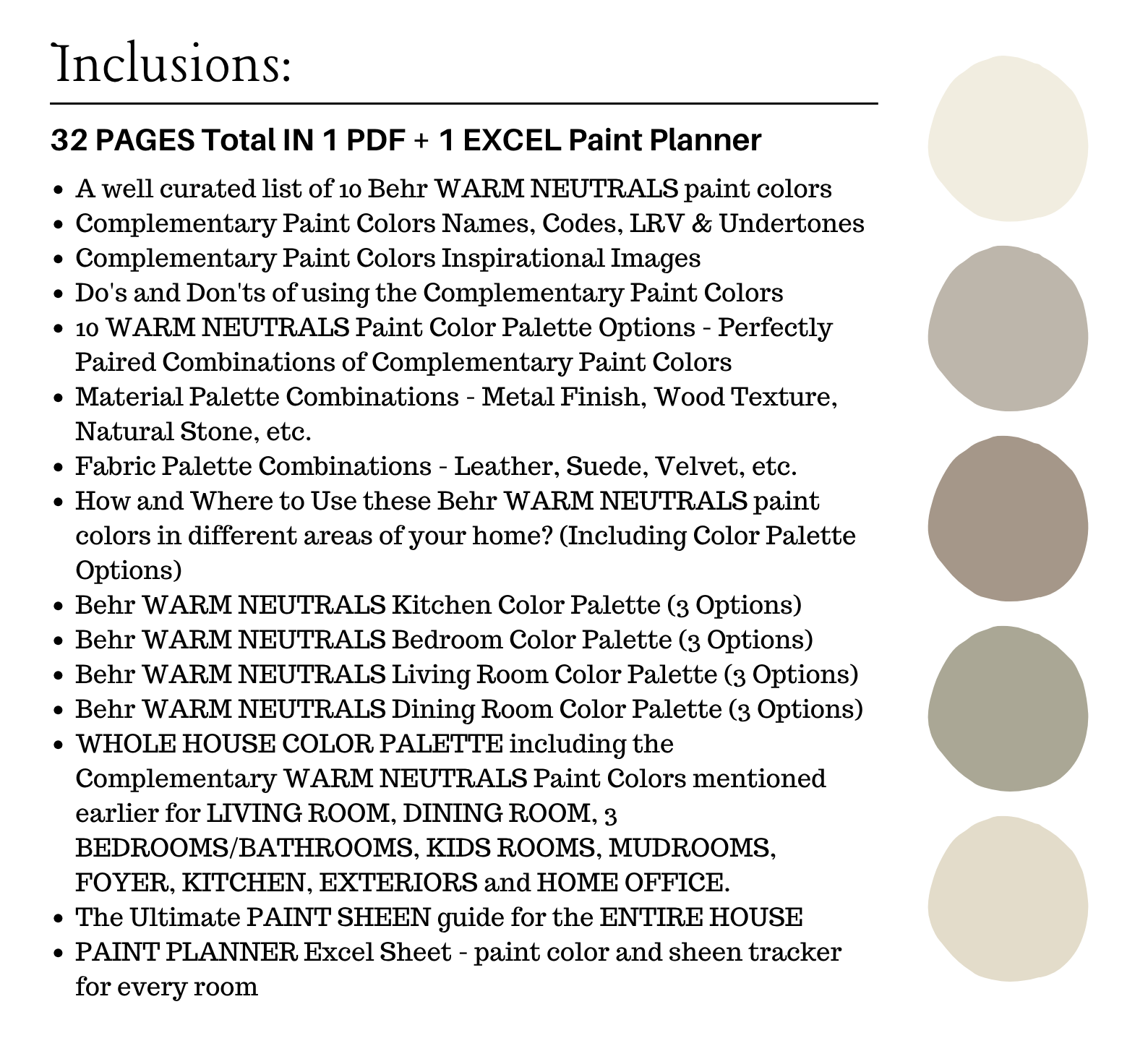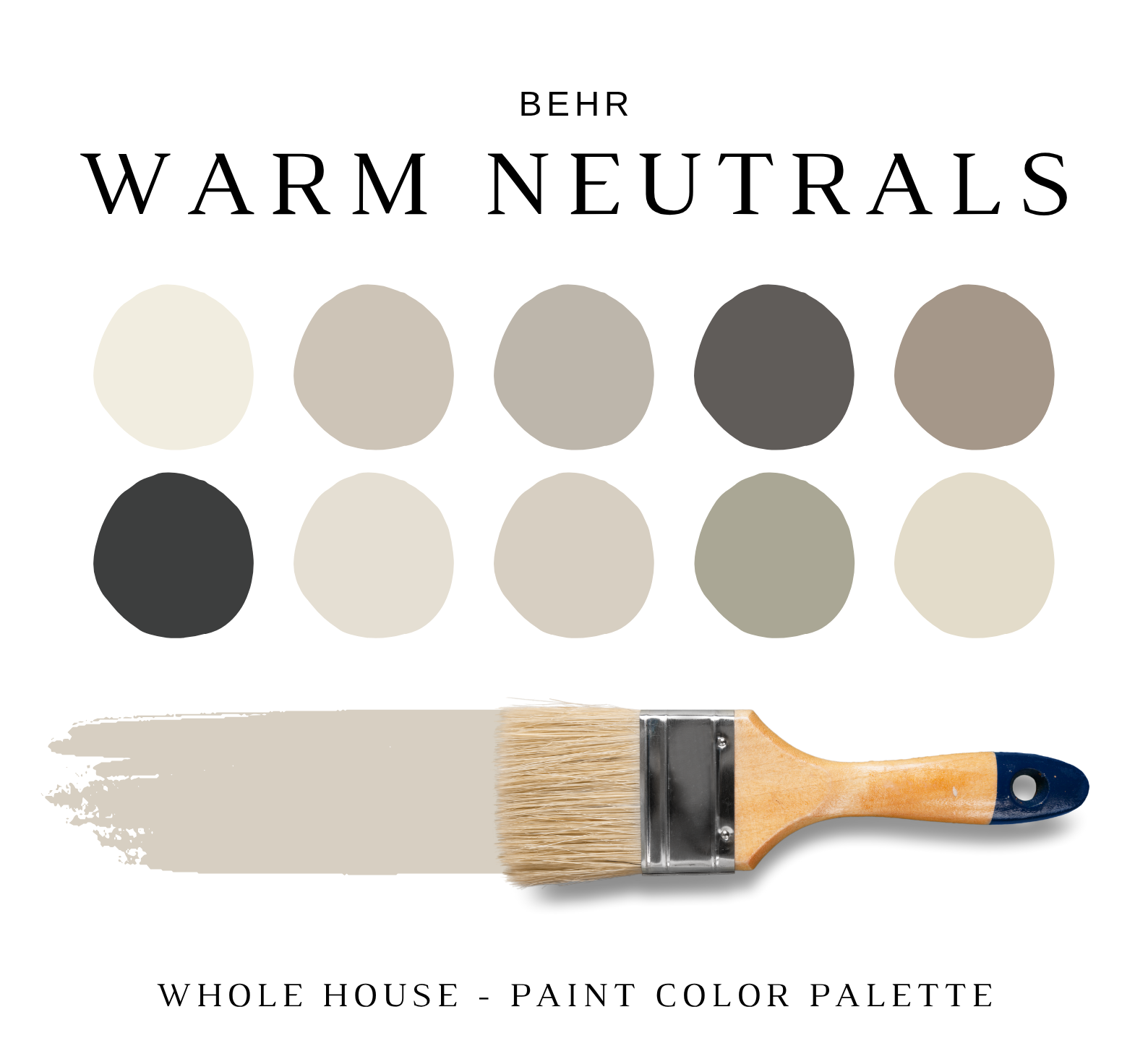 The PDF contains EVERYTHING you need to KNOW about Behr WARM NEUTRALS Color Palette! It includes a list of 10 complementary Behr WARM NEUTRALS Paint Colors that complement each other. This is a PREPACKAGED Behr WARM NEUTRALS Color Palette Selection Listing that includes the Behr complementary color recommendations for walls, ceilings, trims, moldings, doors, and window frames – for your WHOLE HOUSE.