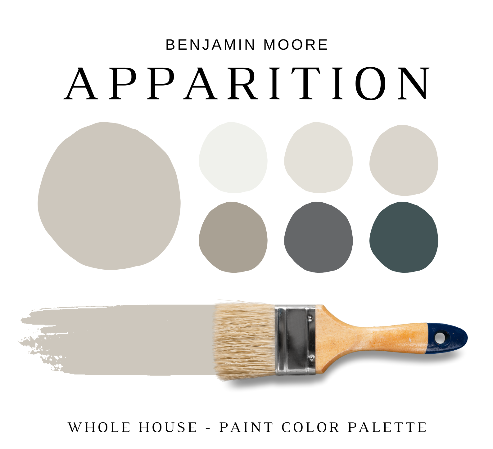 The PDF contains EVERYTHING you need to KNOW about Benjamin Moore APPARITION! It includes a list of complementary Benjamin Moore Paint Colors that can be used to pair with BM APPARITION. This is a PREPACKAGED Color Palette Selection Listing that includes the Benjamin Moore APPARITION color recommendations for walls, ceilings, trims, moldings, doors, and window frames – for your WHOLE HOUSE.