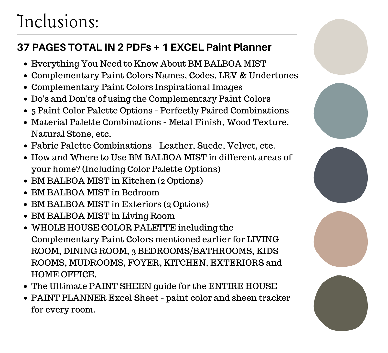 The PDF contains EVERYTHING you need to KNOW about Benjamin Moore BALBOA MIST! It includes a list of complementary Benjamin Moore Paint Colors that can be used to pair with BM BALBOA MIST. This is a PREPACKAGED Color Palette Selection Listing that includes the Benjamin Moore BALBOA MIST color recommendations for walls, ceilings, trims, moldings, doors, and window frames – for your WHOLE HOUSE.