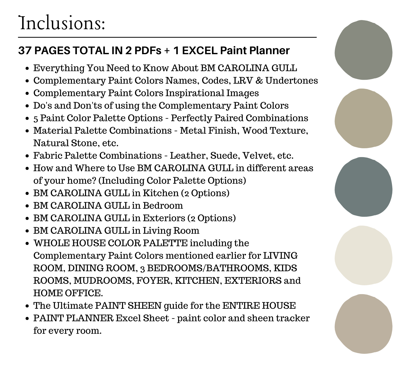 The PDF contains EVERYTHING you need to KNOW about Benjamin Moore CAROLINA GULL! It includes a list of complementary Benjamin Moore Paint Colors that can be used to pair with BM CAROLINA GULL. This is a PREPACKAGED Color Palette Selection Listing that includes the Benjamin Moore CAROLINA GULL color recommendations for walls, ceilings, trims, moldings, doors, and window frames – for your WHOLE HOUSE.
