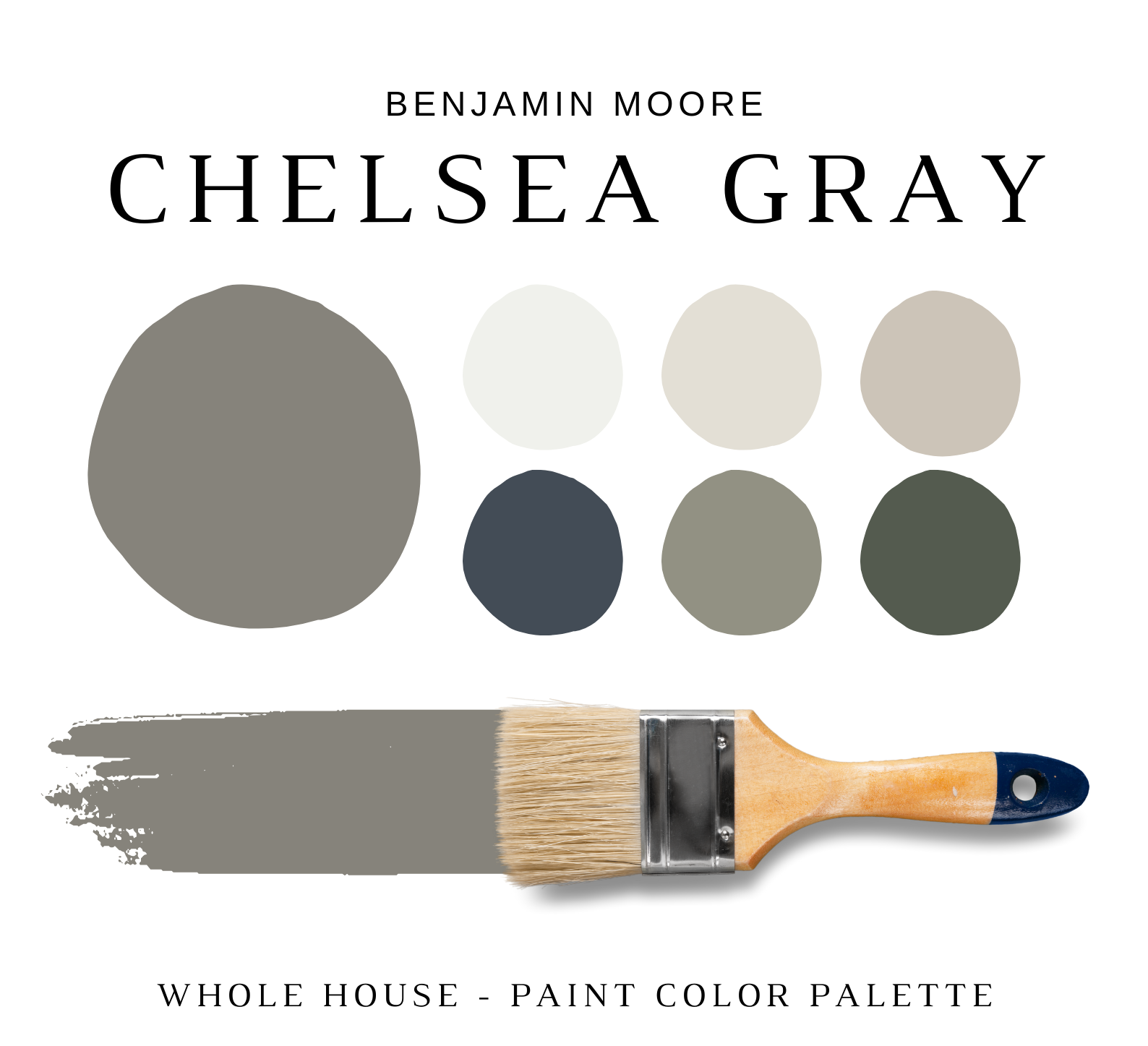 The PDF contains EVERYTHING you need to KNOW about Benjamin Moore CHELSEA GRAY! It includes a list of complementary Benjamin Moore Paint Colors that can be used to pair with BM CHELSEA GRAY. This is a PREPACKAGED Color Palette Selection Listing that includes the Benjamin Moore CHELSEA GRAY color recommendations for walls, ceilings, trims, moldings, doors, and window frames – for your WHOLE HOUSE.
