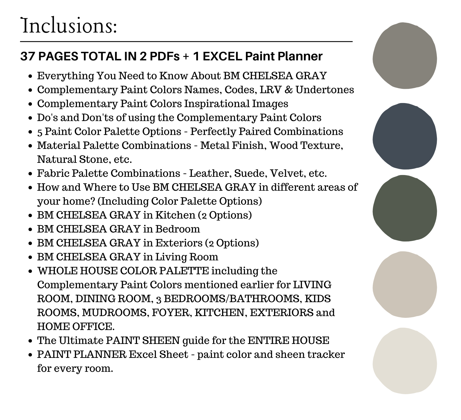 This is a *digital download* Benjamin Moore CHELSEA GRAY Color Palette PDF that contains 38 pages total of information to assist you with quick and easy color selections in your home.