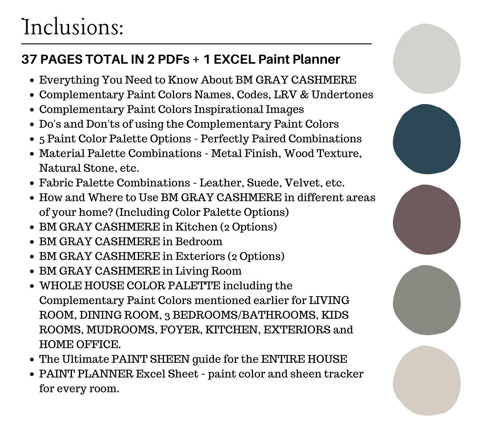 The PDF contains EVERYTHING you need to KNOW about Benjamin Moore GRAY CASHMERE! It includes a list of complementary Benjamin Moore Paint Colors that can be used to pair with BM GRAY CASHMERE. This is a PREPACKAGED Color Palette Selection Listing that includes the Benjamin Moore GRAY CASHMERE color recommendations for walls, ceilings, trims, moldings, doors, and window frames – for your WHOLE HOUSE.
