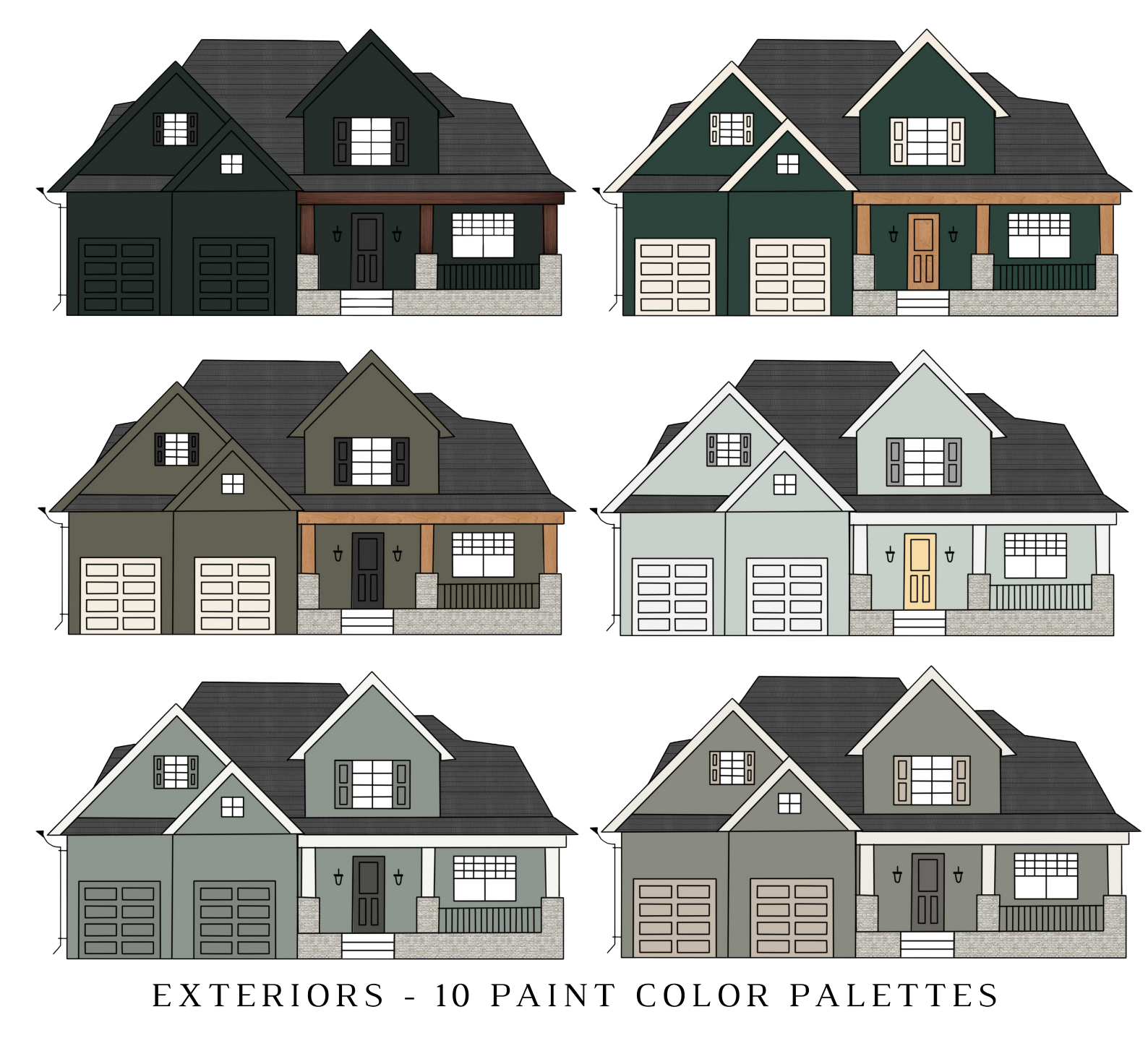 It also includes the DECORATING TIPS and material color palette (satin brass, matte black, polished chrome, wood stains, or copper that resonates with the color palette) and color ideas for windows, door trims, garage doors, and shutters. This guideline also includes a couple of design inspirations and color ideas for various EXTERIOR DESIGN STYLES and brick combinations like RED, ORANGE, TAN, and RUST Brick! You will also find 3 FRONT DOOR Paint Color Ideas for each GREEN Exterior Homes.