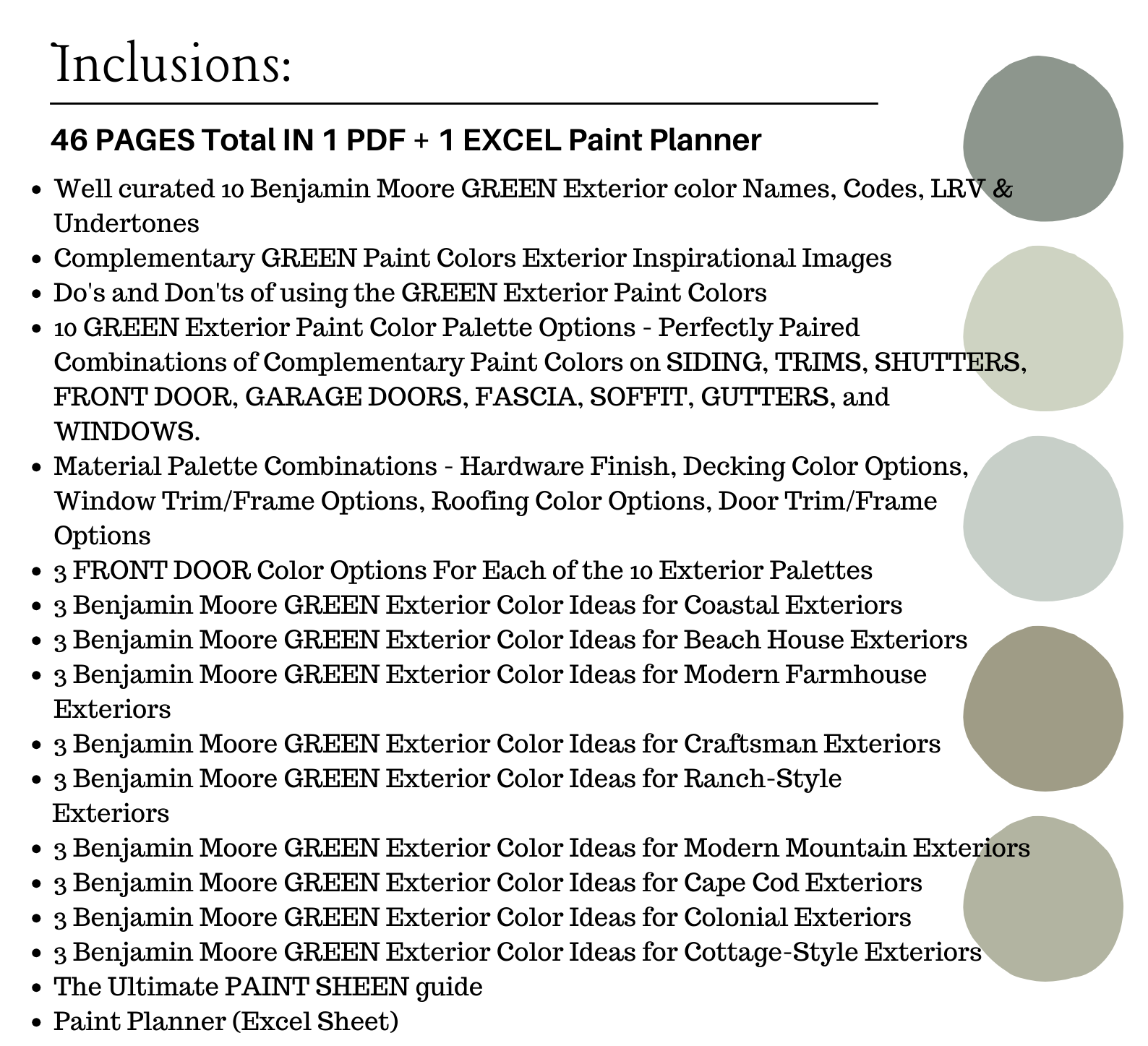 The PDF contains EVERYTHING you need to KNOW about Benjamin Moore GREEN EXTERIORS Paint Colors! It includes 10 Benjamin Moore GREEN EXTERIOR Paint Color Palettes and the best possible advice to decorate around them. This is a PREPACKAGED Color Palette Selection Listing that includes the GREEN Benjamin Moore complementary color recommendations for Siding, Front Door, Decking, Hardware, Window Frame/Trim, Door Frame/Trim, Shutters, Garage Doors, Fascia, Soffits, Trims, Gutters, and Possible Brick combinations like RED, ORANGE, TAN, and RUST Brick.