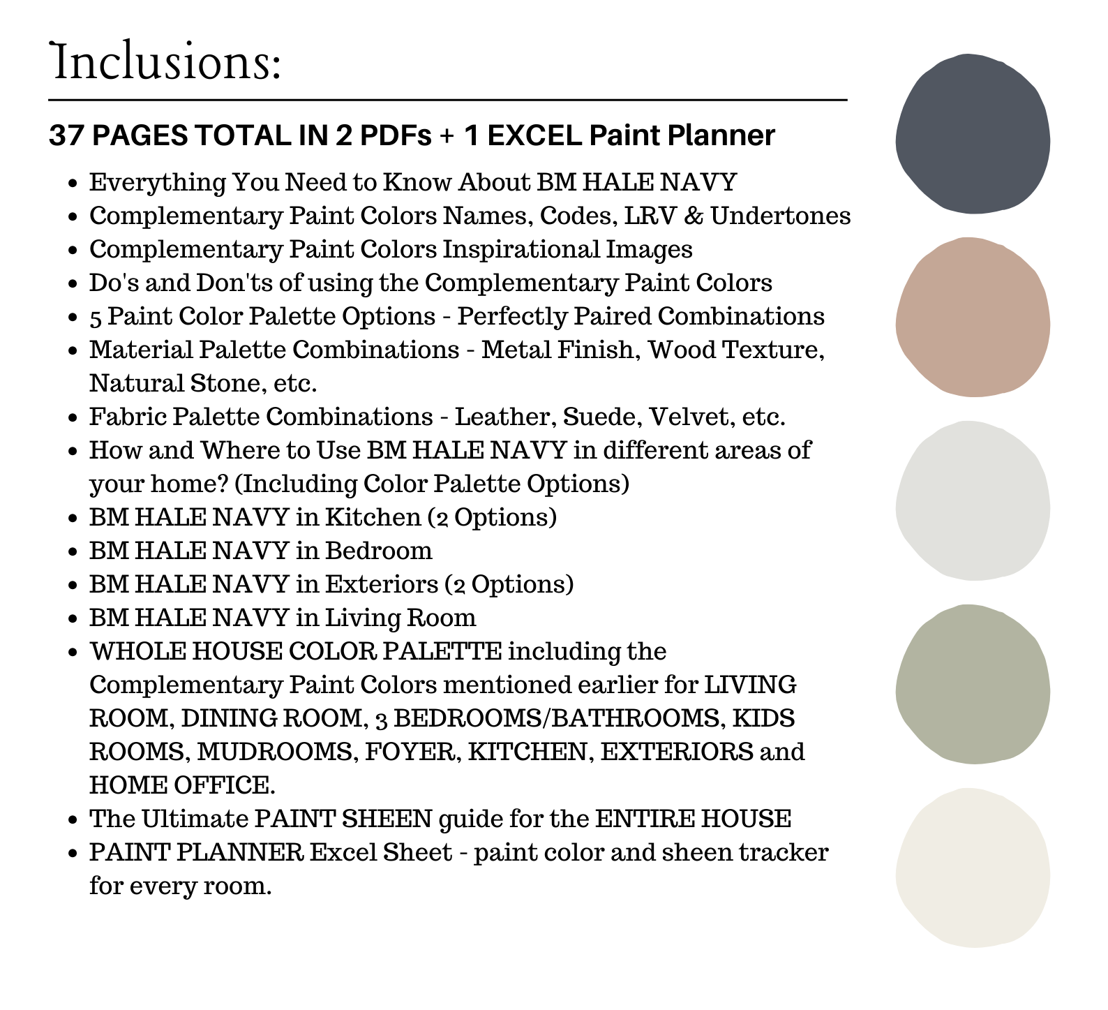 The PDF contains EVERYTHING you need to KNOW about Benjamin Moore HALE NAVY! It includes a list of complementary Benjamin Moore Paint Colors that can be used to pair with BM HALE NAVY. This is a PREPACKAGED Color Palette Selection Listing that includes the Benjamin Moore HALE NAVY color recommendations for walls, ceilings, trims, moldings, doors, and window frames – for your WHOLE HOUSE.