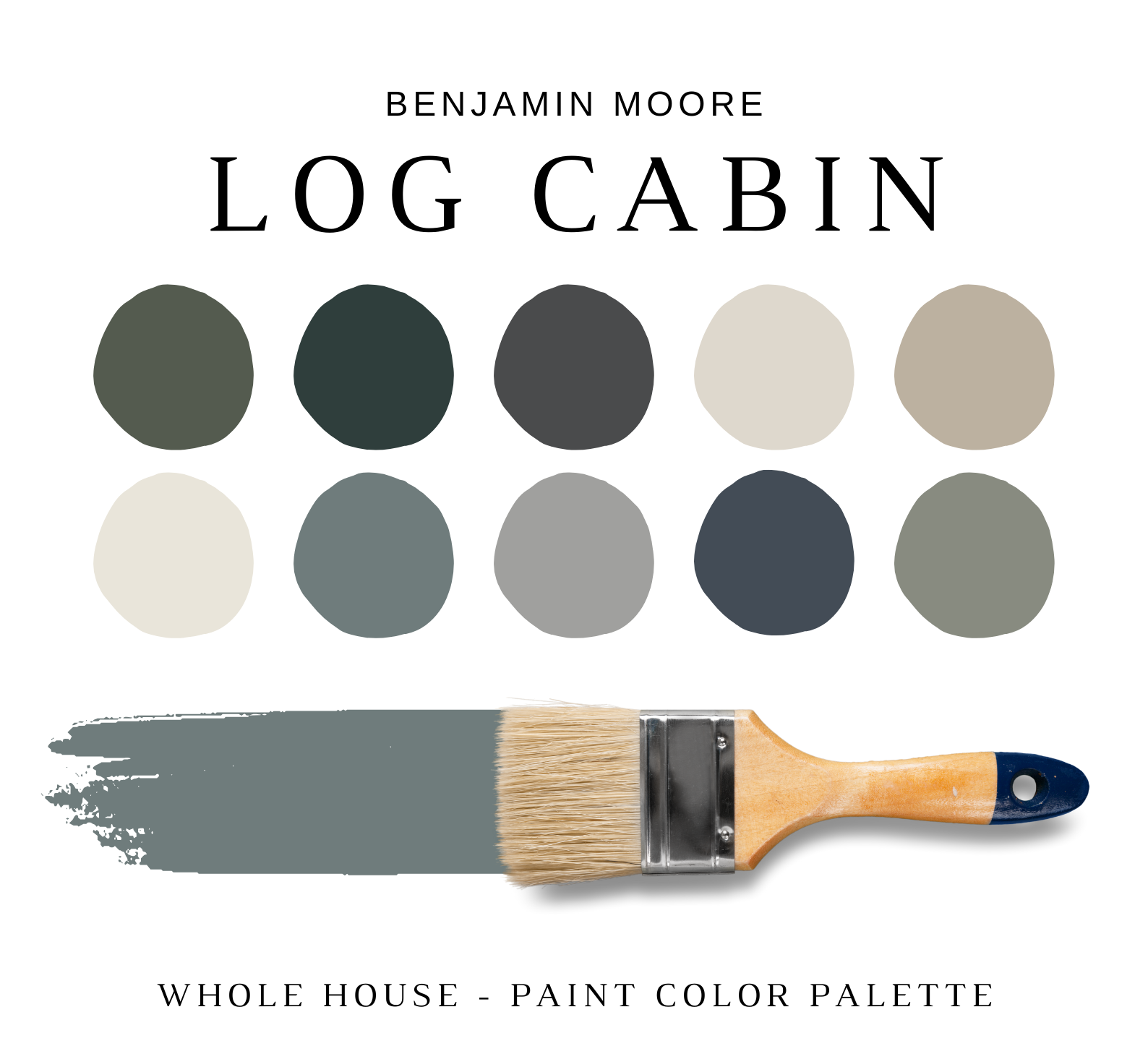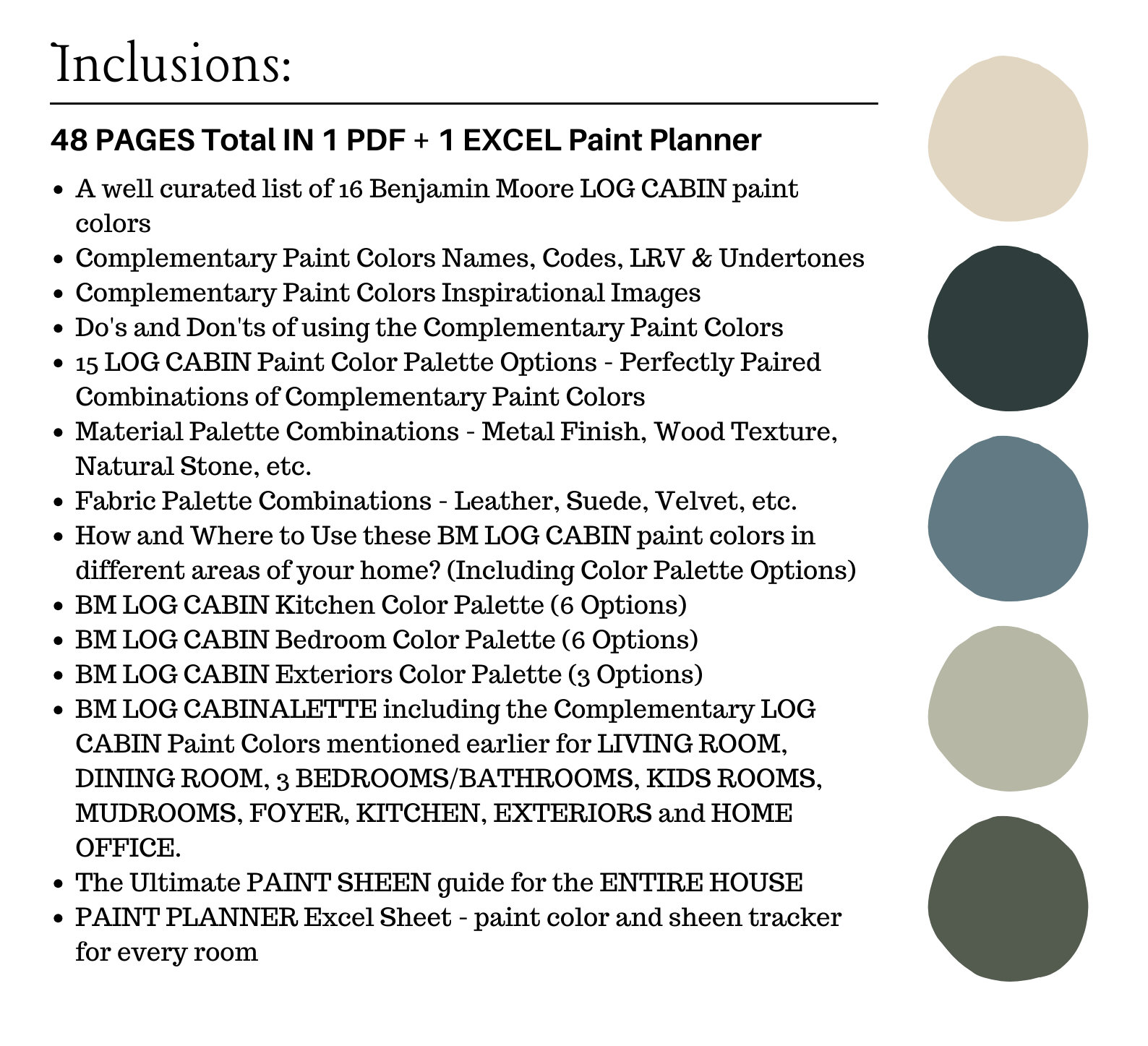 The PDF contains EVERYTHING you need to KNOW about Benjamin Moore LOG CABIN Color Palette! It includes a list of 16 complementary Benjamin Moore LOG CABIN Paint Colors that complement each other. This is a PREPACKAGED Benjamin Moore LOG CABIN Color Palette Selection Listing that includes the Benjamin Moore complementary color recommendations for walls, ceilings, trims, moldings, doors, and window frames – for your WHOLE HOUSE.