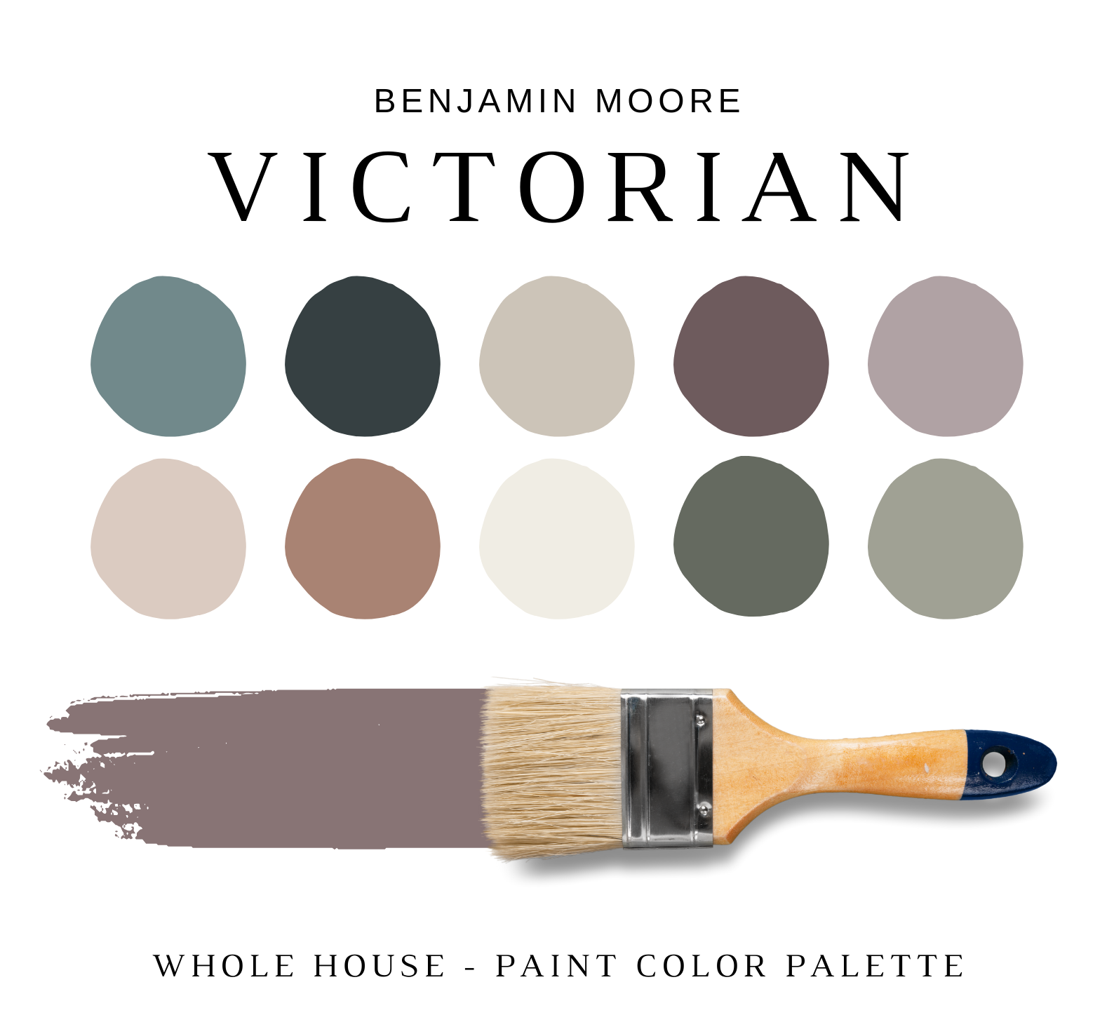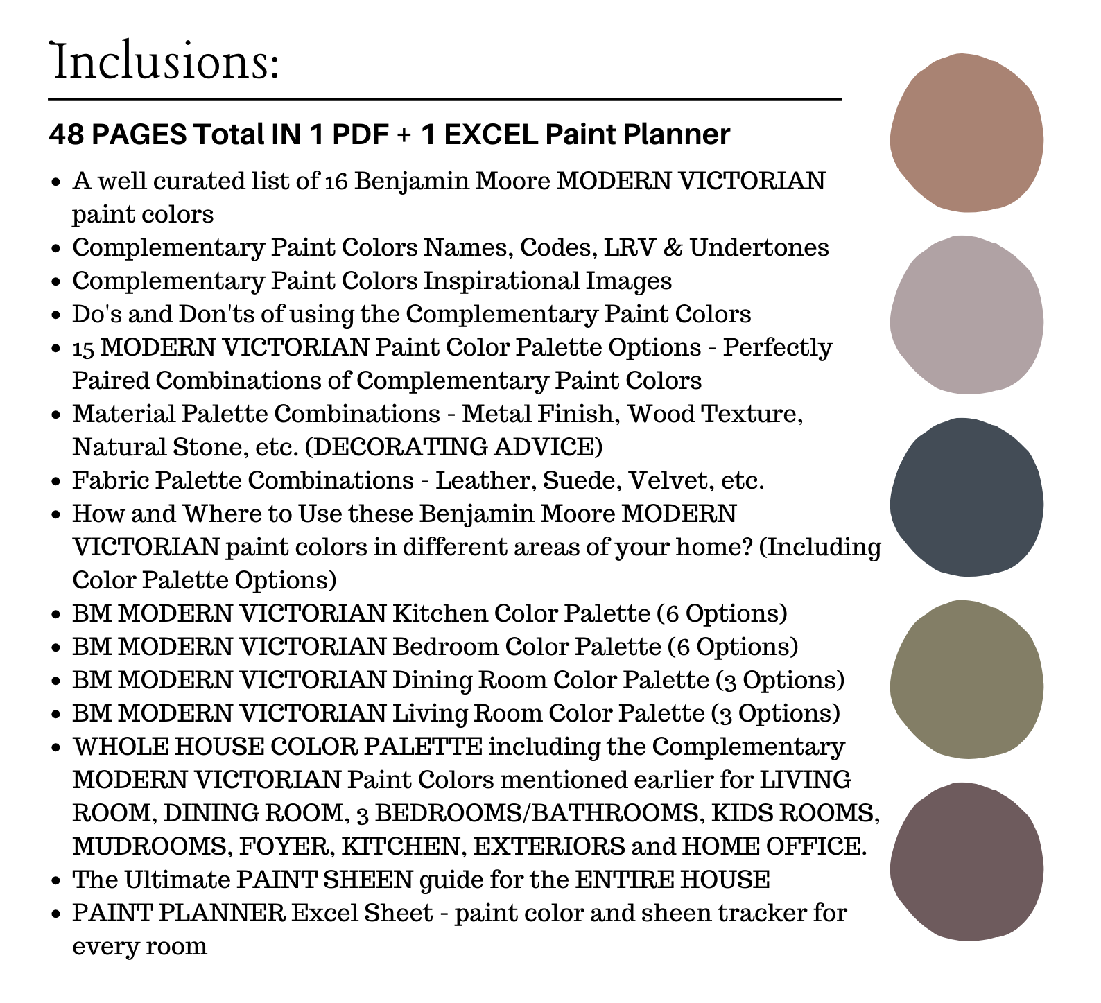 The PDF contains EVERYTHING you need to KNOW about Benjamin Moore MODERN VICTORIAN Color Palette! It includes a list of 16 complementary Benjamin Moore MODERN VICTORIAN Paint Colors that complement each other. This is a PREPACKAGED Benjamin Moore MODERN VICTORIAN Color Palette Selection Listing that includes the Benjamin Moore complementary color recommendations for walls, ceilings, trims, moldings, doors, and window frames – for your WHOLE HOUSE.