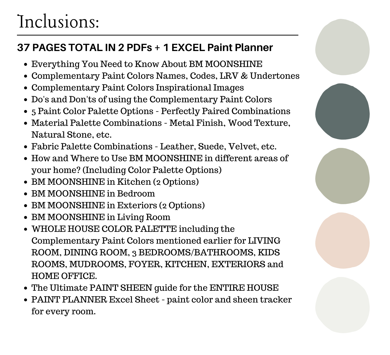 This is a *digital download* Benjamin Moore MOONSHINE Color Palette PDF that contains 38 pages total of information to assist you with quick and easy color selections in your home.