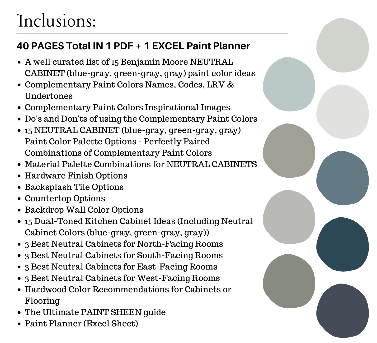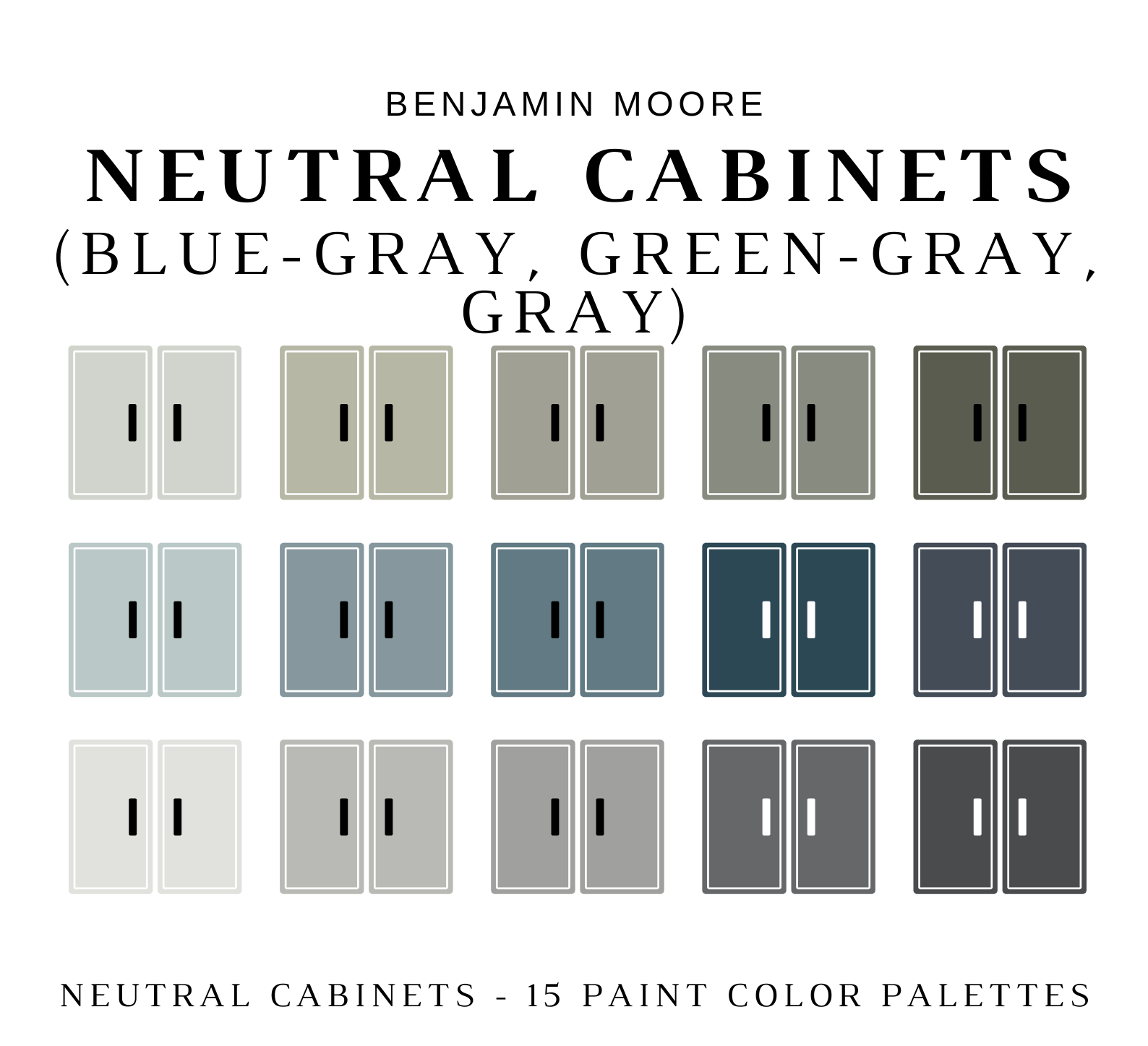 The PDF contains EVERYTHING you need to KNOW about Benjamin Moore NEUTRAL KITCHEN CABINET, BATHROOM VANITY, or BUILT-IN SHELVES Paint Colors! It includes a list of 15 complementary Benjamin Moore NEUTRAL CABINET Paint Colors (green-gray, blue-gray, navy blue, gray, black) that will best work in a home. This is a PREPACKAGED Color Palette Selection Listing that includes the Benjamin Moore complementary color recommendations of those cabinets with respect to HARDWARE options, BACKSPLASH TILE options, HARDWOOD stain options, COUNTERTOP options, and BACKDROP WALL color options.