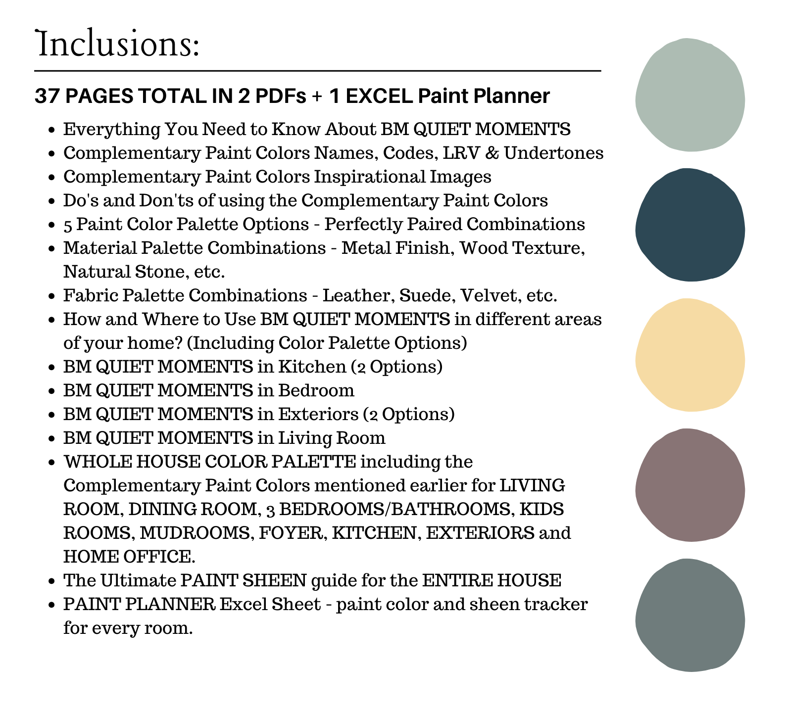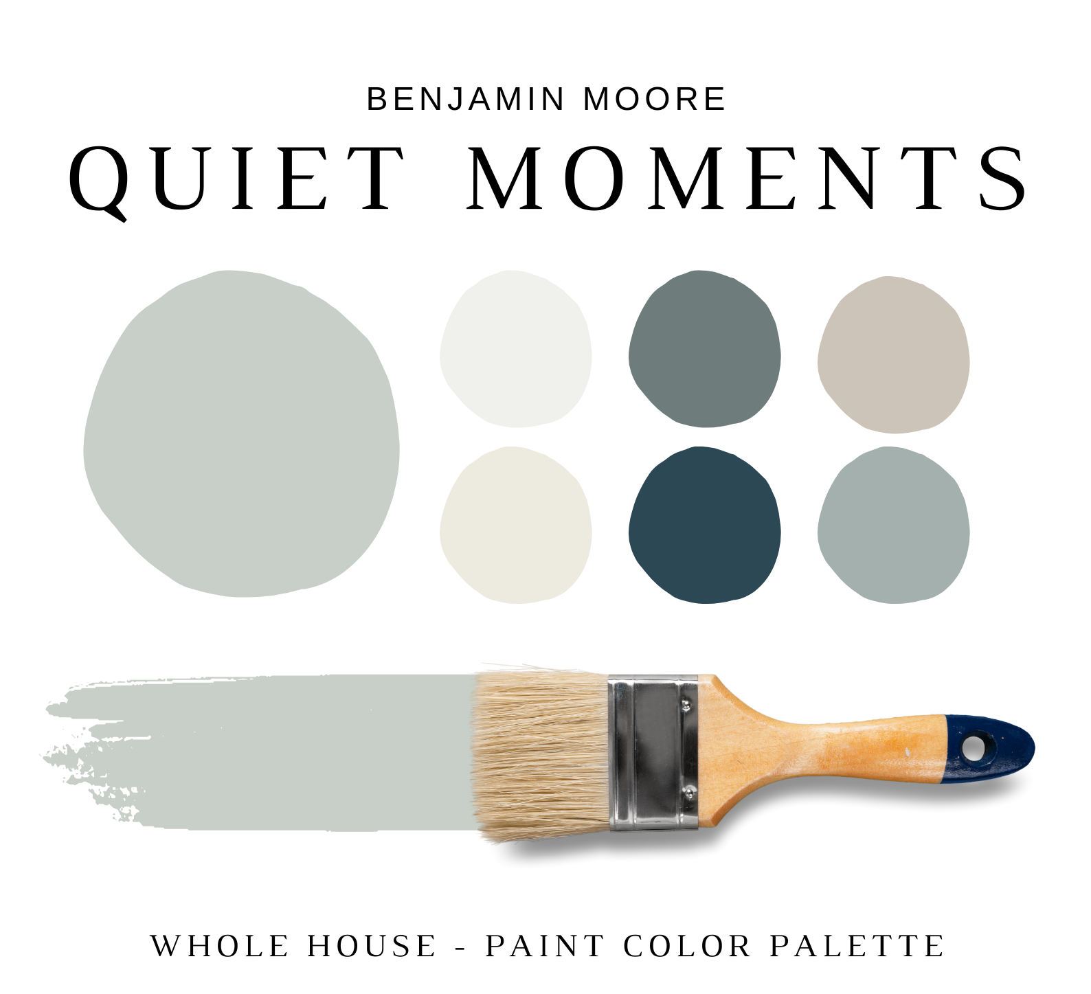The PDF contains EVERYTHING you need to KNOW about Benjamin Moore QUIET MOMENTS! It includes a list of complementary Benjamin Moore Paint Colors that can be used to pair with BM QUIET MOMENTS. This is a PREPACKAGED Color Palette Selection Listing that includes the Benjamin Moore QUIET MOMENTS color recommendations for walls, ceilings, trims, moldings, doors, and window frames – for your WHOLE HOUSE.