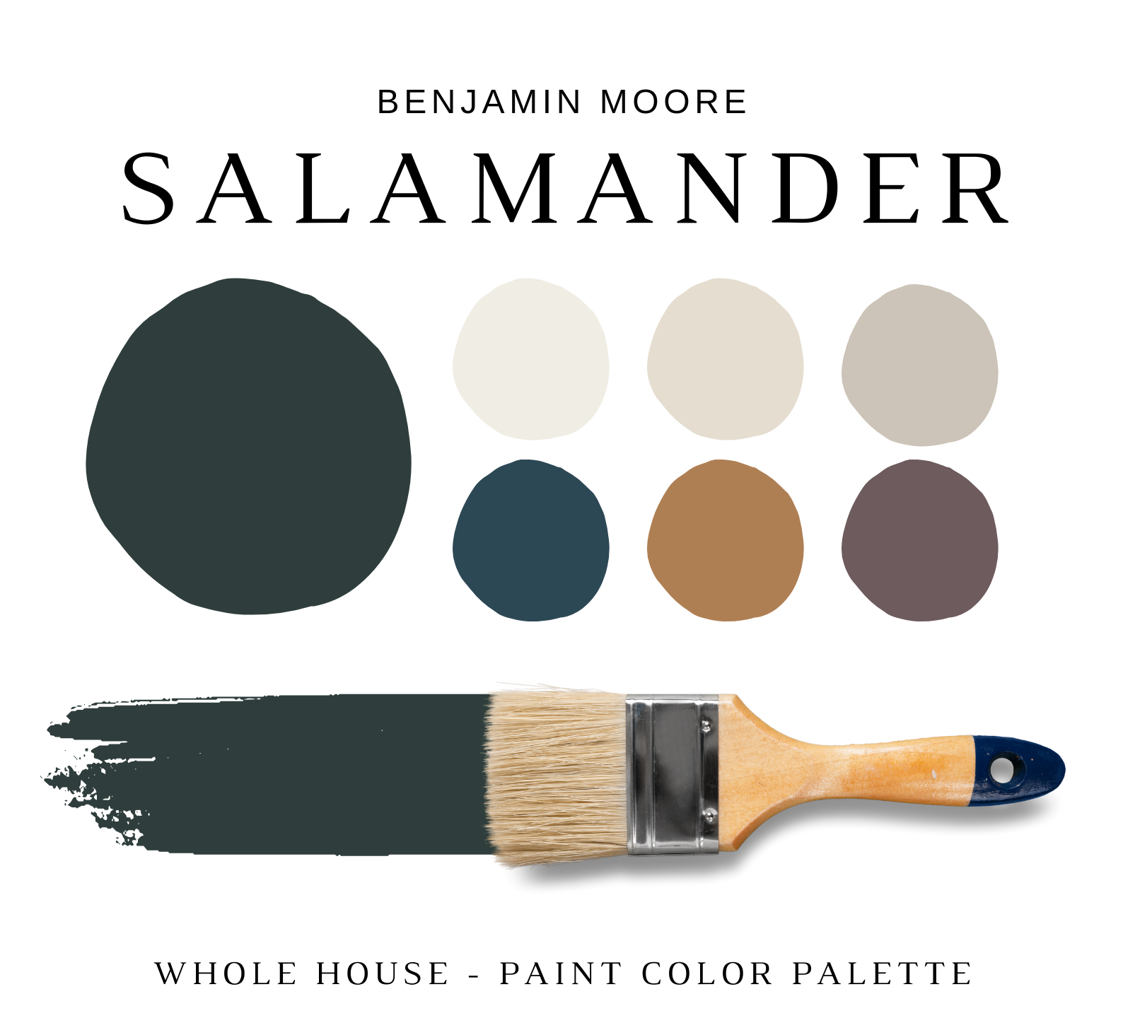 The PDF contains EVERYTHING you need to KNOW about Benjamin Moore SALAMANDER! It includes a list of complementary Benjamin Moore Paint Colors that can be used to pair with BM SALAMANDER. This is a PREPACKAGED Color Palette Selection Listing that includes the Benjamin Moore SALAMANDER color recommendations for walls, ceilings, trims, moldings, doors, and window frames – for your WHOLE HOUSE.