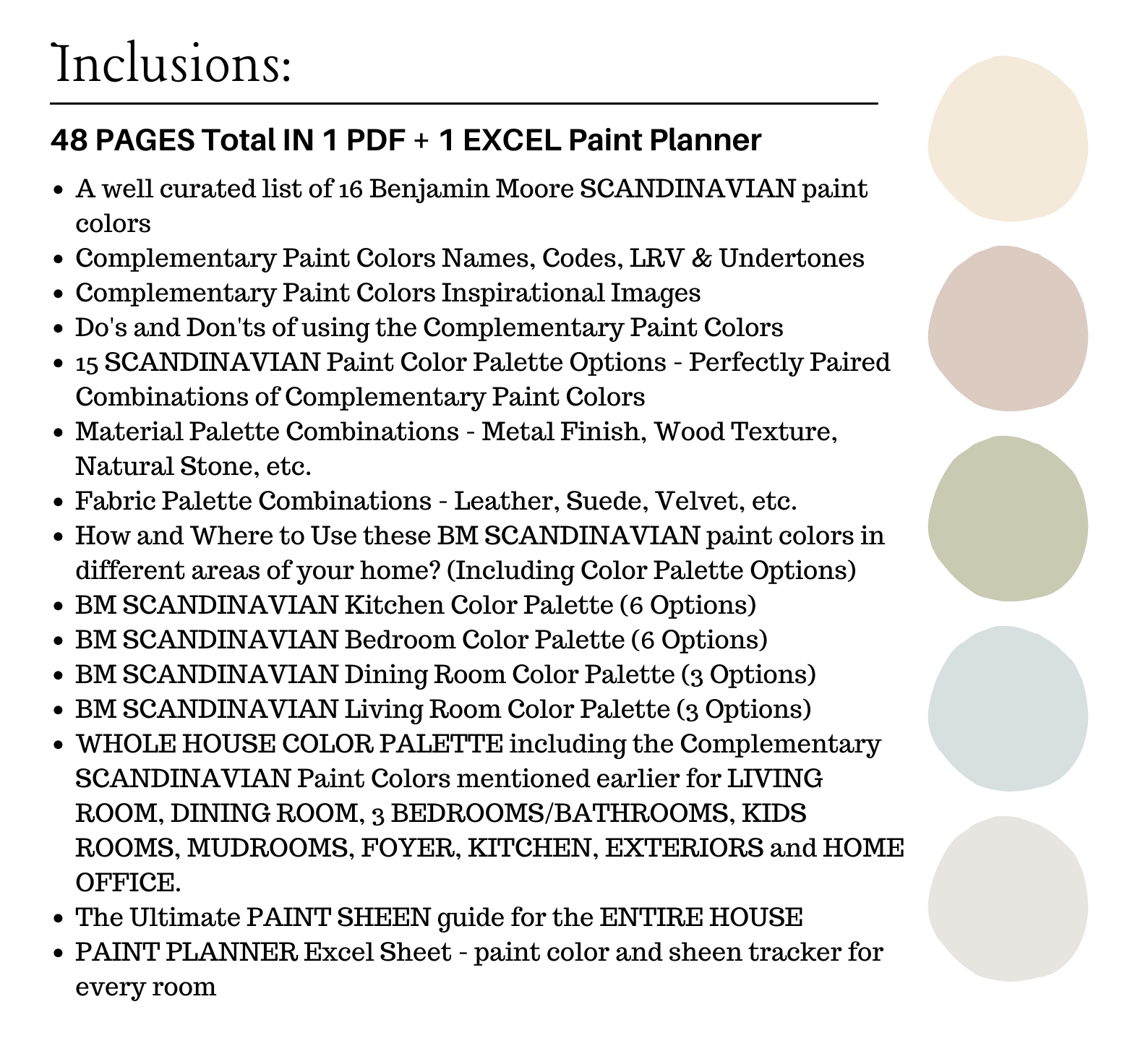 The PDF contains EVERYTHING you need to KNOW about Benjamin Moore SCANDINAVIAN Color Palette! It includes a list of 16 complementary Benjamin Moore SCANDINAVIAN Paint Colors that complement each other. This is a PREPACKAGED Benjamin Moore SCANDINAVIAN Color Palette Selection Listing that includes the Benjamin Moore complementary color recommendations for walls, ceilings, trims, moldings, doors, and window frames – for your WHOLE HOUSE.