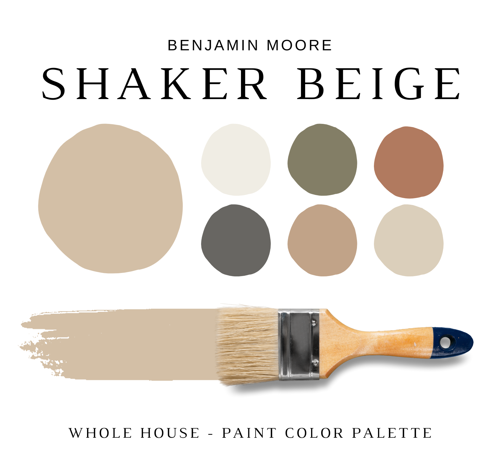 The PDF contains EVERYTHING you need to KNOW about Benjamin Moore SHAKER BEIGE! It includes a list of complementary Benjamin Moore Paint Colors that can be used to pair with BM SHAKER BEIGE. This is a PREPACKAGED Color Palette Selection Listing that includes the Benjamin Moore SHAKER BEIGE color recommendations for walls, ceilings, trims, moldings, doors, and window frames – for your WHOLE HOUSE.