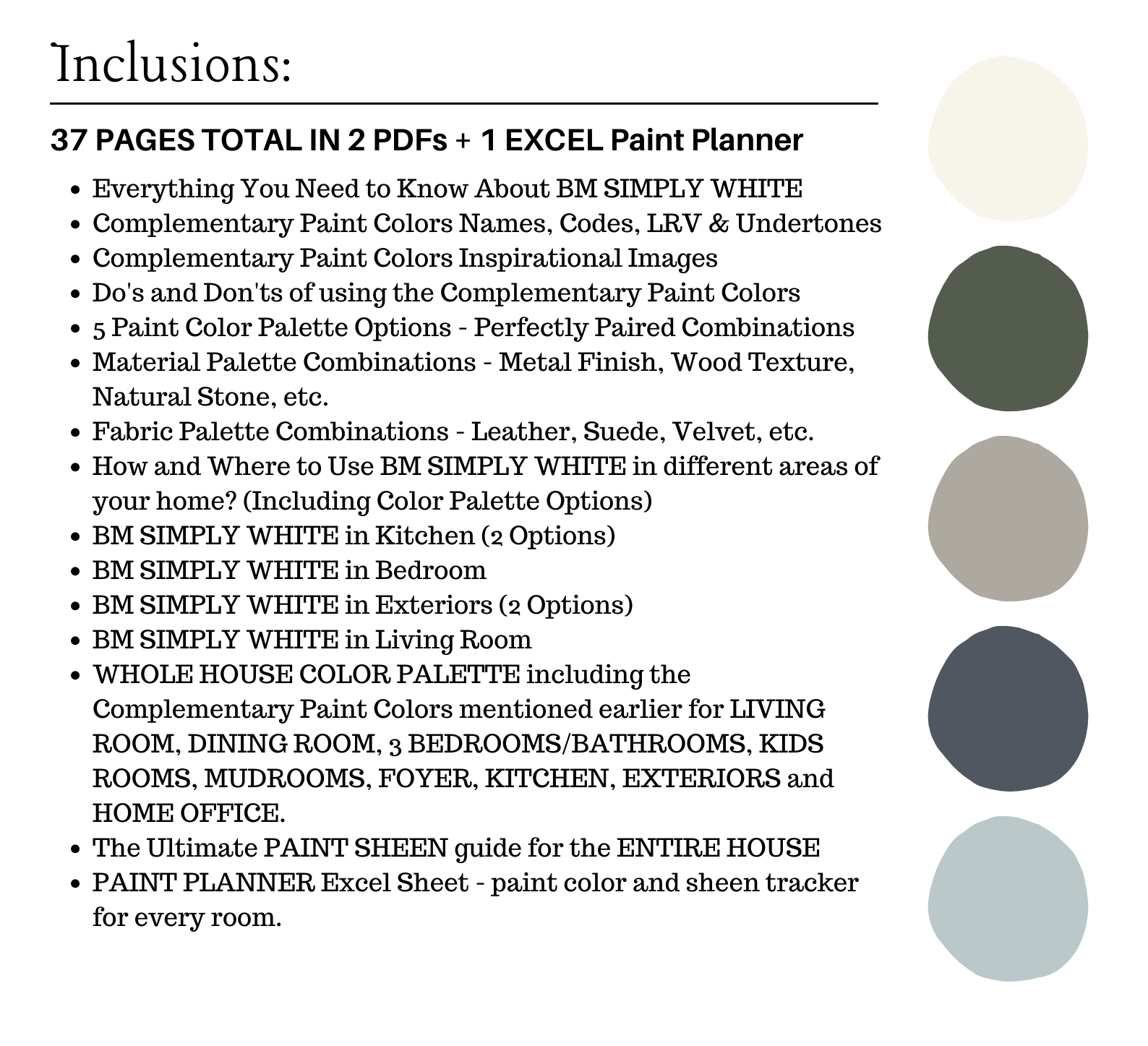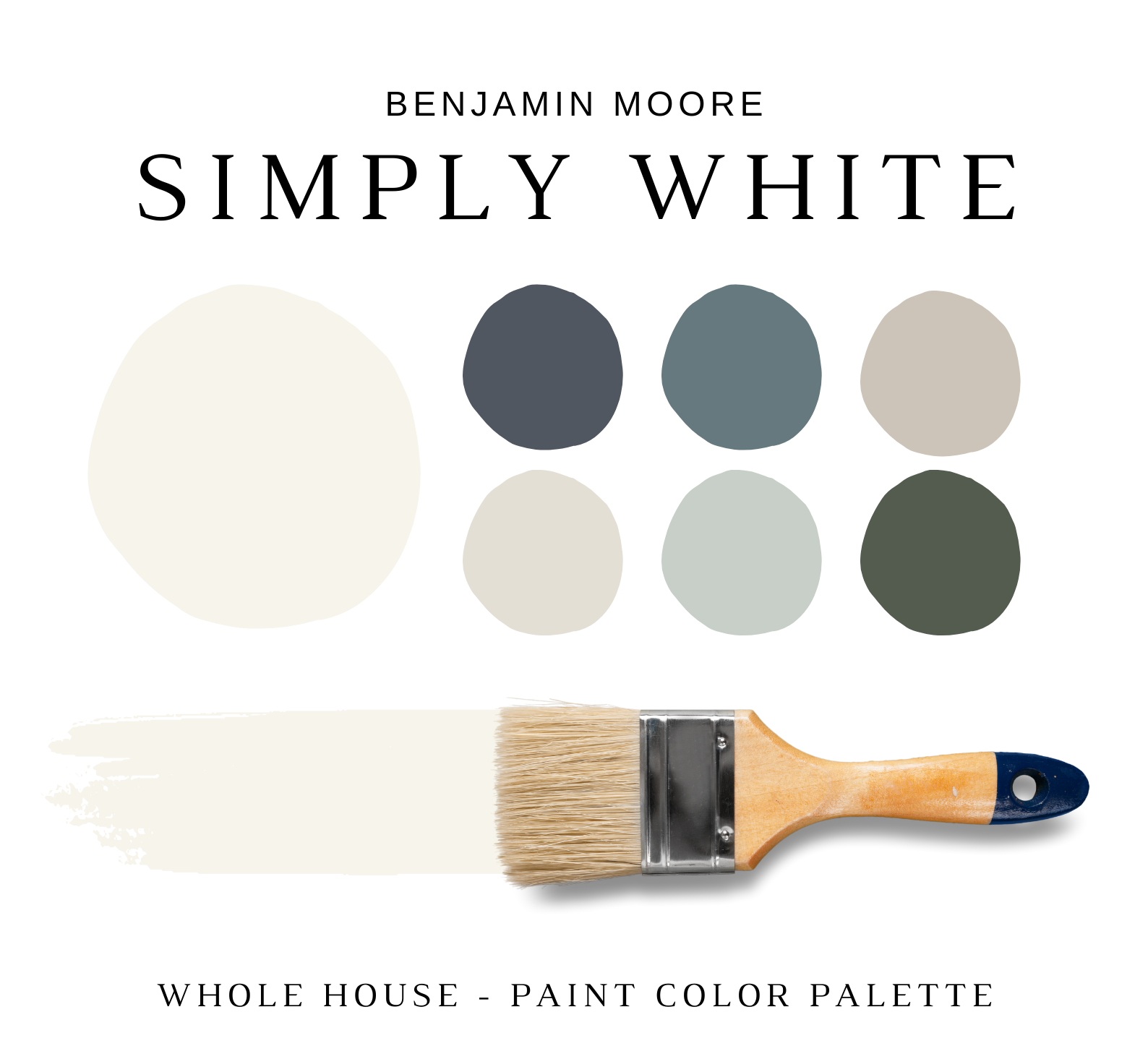 The PDF contains EVERYTHING you need to KNOW about Benjamin Moore SIMPLY WHITE! It includes a list of complementary Benjamin Moore Paint Colors that can be used to pair with BM SIMPLY WHITE. This is a PREPACKAGED Color Palette Selection Listing that includes the Benjamin Moore SIMPLY WHITE color recommendations for walls, ceilings, trims, moldings, doors, and window frames – for your WHOLE HOUSE.