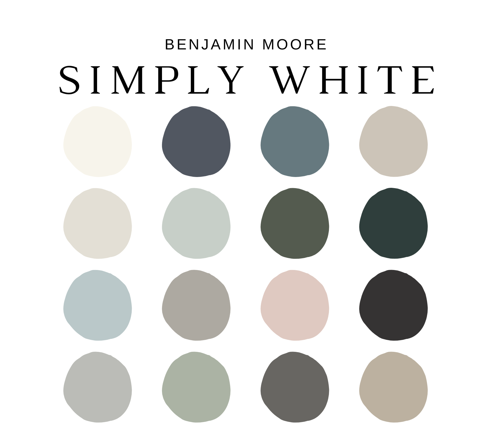 This is a *digital download* Benjamin Moore SIMPLY WHITE Color Palette PDF that contains 38 pages total of information to assist you with quick and easy color selections in your home.