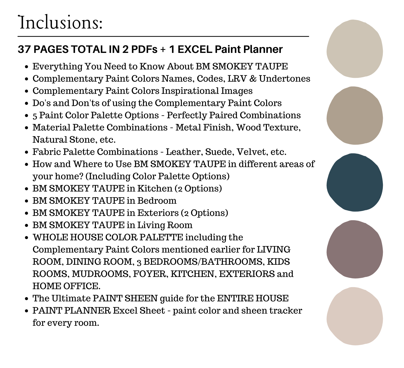 This is a *digital download* Benjamin Moore SMOKEY TAUPE Color Palette PDF that contains 38 pages total of information to assist you with quick and easy color selections in your home.