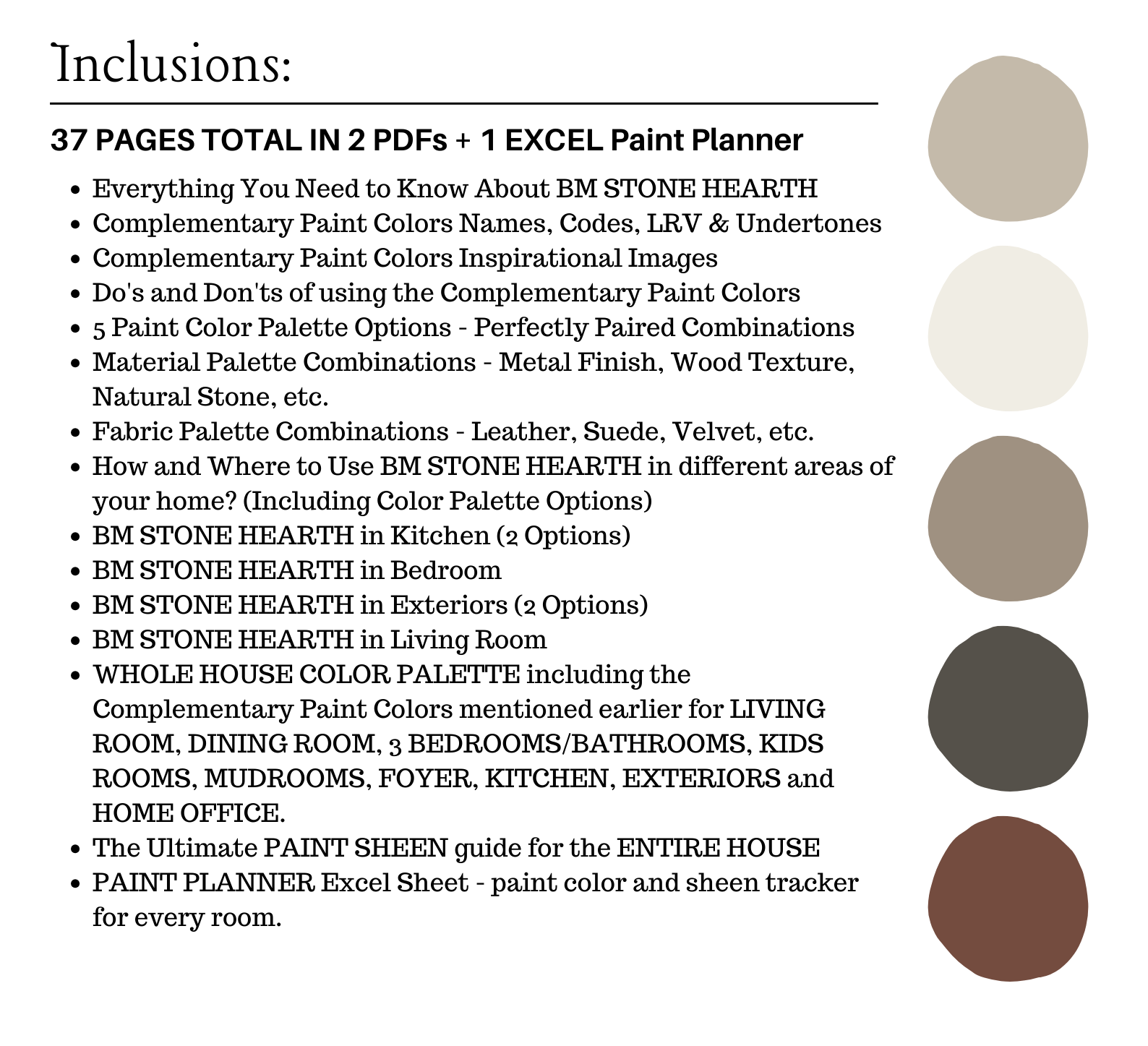 The PDF contains EVERYTHING you need to KNOW about Benjamin Moore STONE HEARTH! It includes a list of complementary Benjamin Moore Paint Colors that can be used to pair with BM STONE HEARTH. This is a PREPACKAGED Color Palette Selection Listing that includes the Benjamin Moore STONE HEARTH color recommendations for walls, ceilings, trims, moldings, doors, and window frames – for your WHOLE HOUSE.