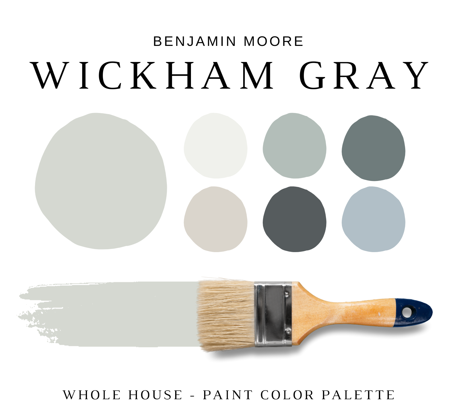 The PDF contains EVERYTHING you need to KNOW about Benjamin Moore WICKHAM GRAY! It includes a list of complementary Benjamin Moore Paint Colors that can be used to pair with BM WICKHAM GRAY. This is a PREPACKAGED Color Palette Selection Listing that includes the Benjamin Moore WICKHAM GRAY color recommendations for walls, ceilings, trims, moldings, doors, and window frames – for your WHOLE HOUSE.