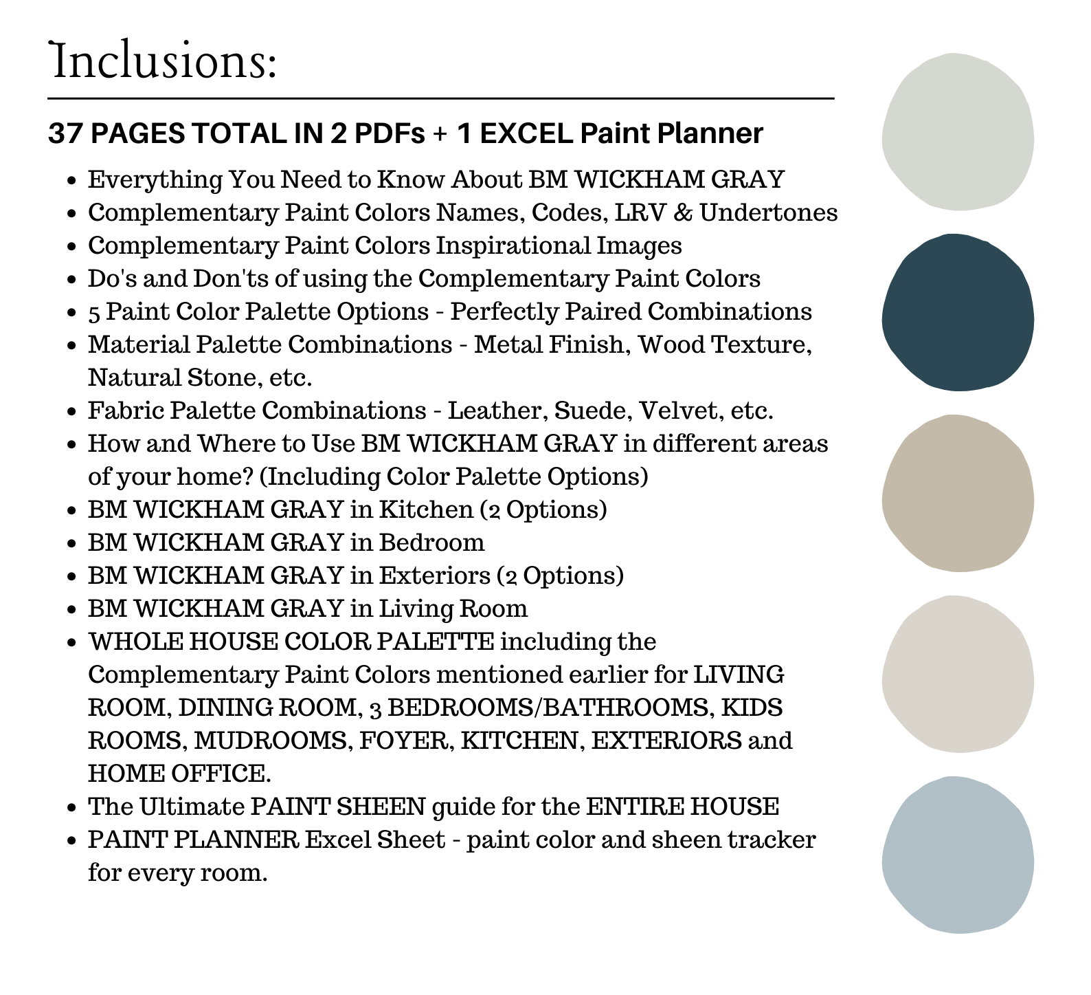 This is a *digital download* Benjamin Moore WICKHAM GRAY Color Palette PDF that contains 38 pages total of information to assist you with quick and easy color selections in your home.