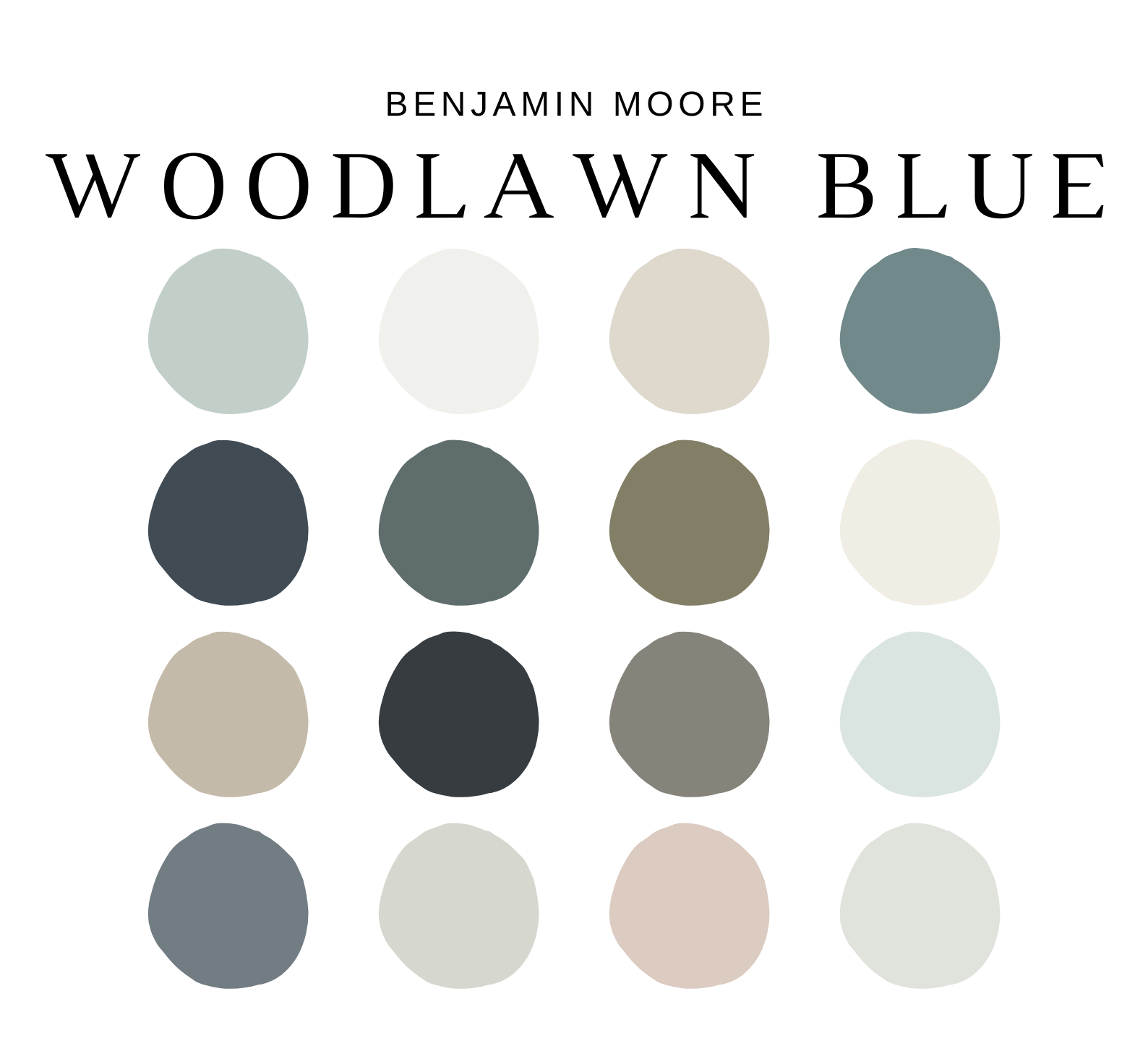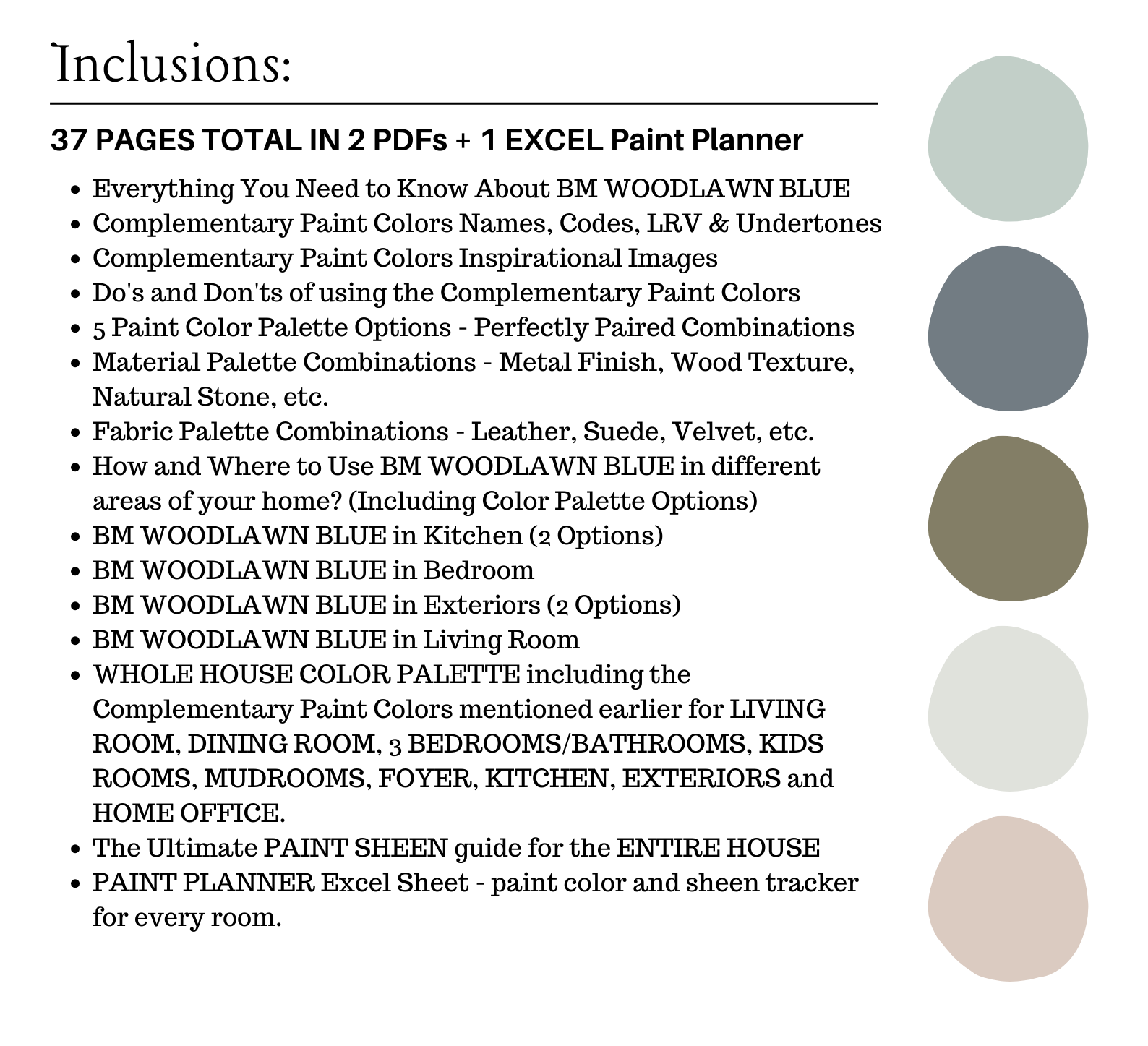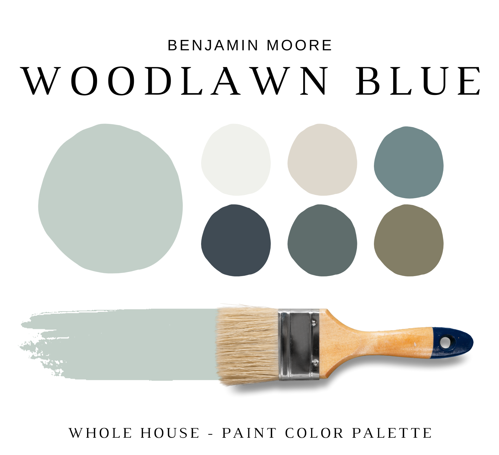 The PDF contains EVERYTHING you need to KNOW about Benjamin Moore WOODLAWN BLUE! It includes a list of complementary Benjamin Moore Paint Colors that can be used to pair with BM WOODLAWN BLUE. This is a PREPACKAGED Color Palette Selection Listing that includes the Benjamin Moore WOODLAWN BLUE color recommendations for walls, ceilings, trims, moldings, doors, and window frames – for your WHOLE HOUSE.