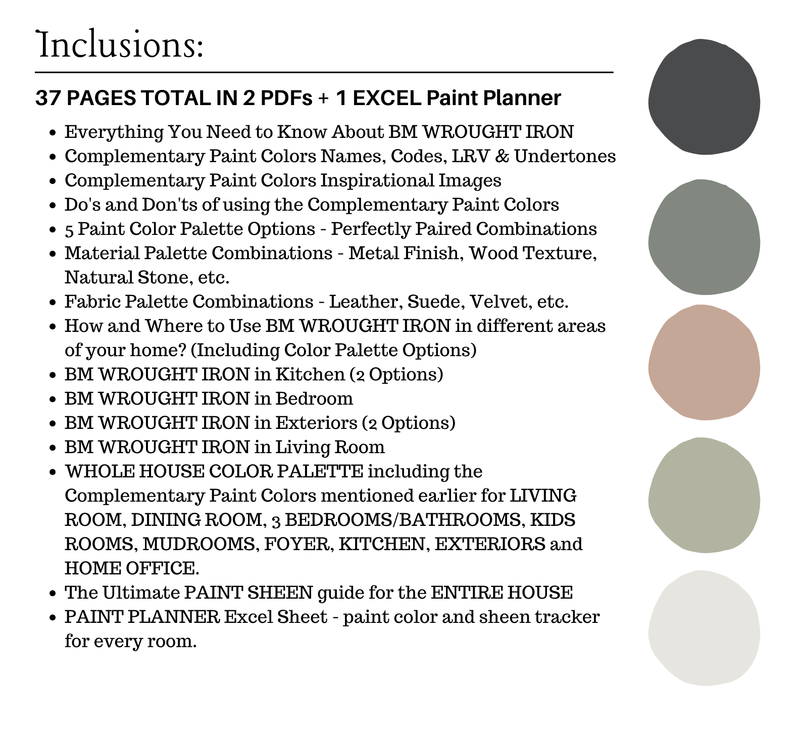 The PDF contains EVERYTHING you need to KNOW about Benjamin Moore WROUGHT IRON! It includes a list of complementary Benjamin Moore Paint Colors that can be used to pair with BM WROUGHT IRON. This is a PREPACKAGED Color Palette Selection Listing that includes the Benjamin Moore WROUGHT IRON color recommendations for walls, ceilings, trims, moldings, doors, and window frames – for your WHOLE HOUSE.