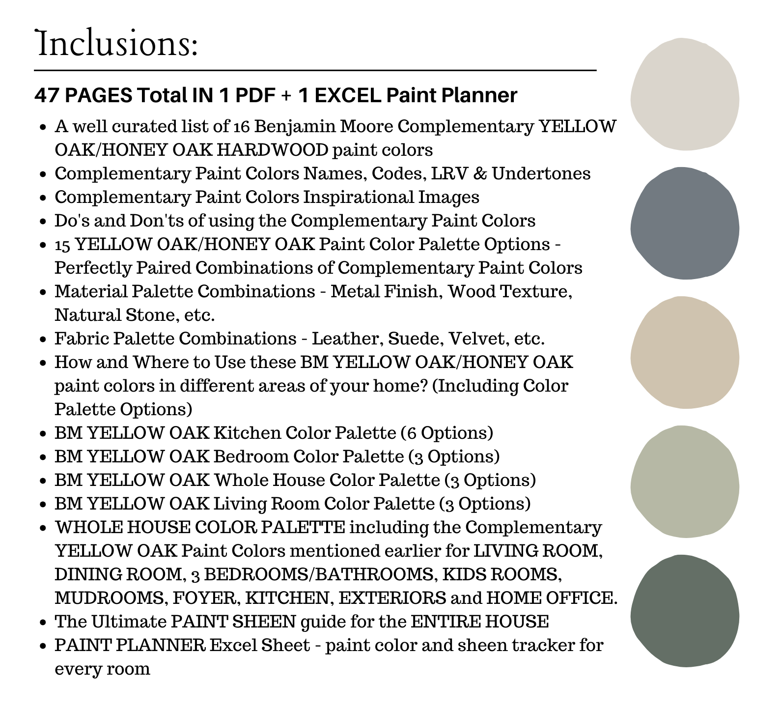 You will also find 15 PAINT COLOR COMBINATIONS (paint color palettes) while using 16 complementary colors and where and how to use this paint in different areas of your home! There are various Benjamin Moore YELLOW HARDWOOD paint color schemes recommendations for your kitchens, living room, Exterior, as well as bedrooms.
