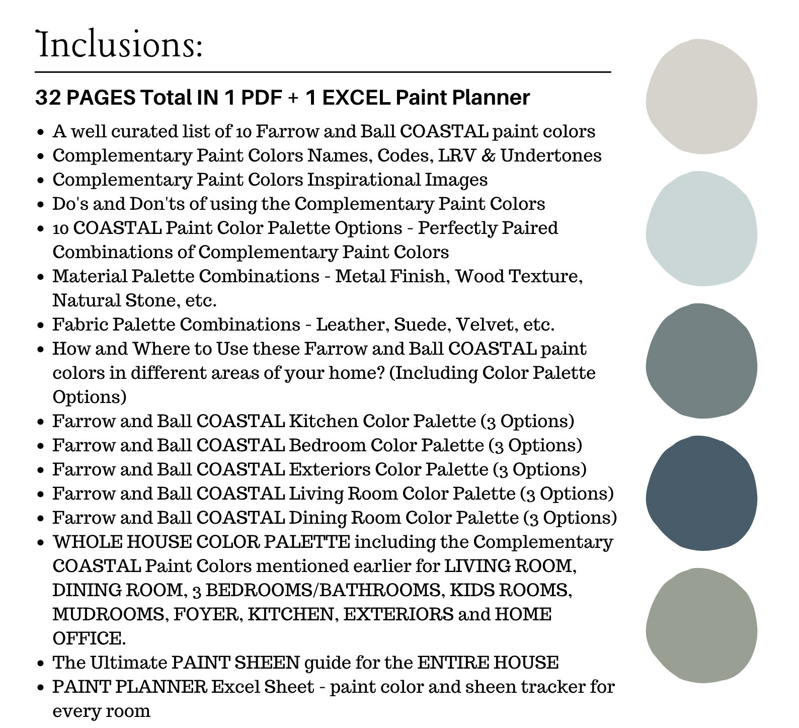 The PDF contains EVERYTHING you need to KNOW about Farrow and Ball COASTAL Color Palette! It includes a list of 10 complementary Farrow and Ball COASTAL Paint Colors that complement each other. This is a PREPACKAGED Farrow and Ball COASTAL Color Palette Selection Listing that includes the Farrow and Ball complementary color recommendations for walls, ceilings, trims, moldings, doors, and window frames – for your WHOLE HOUSE.