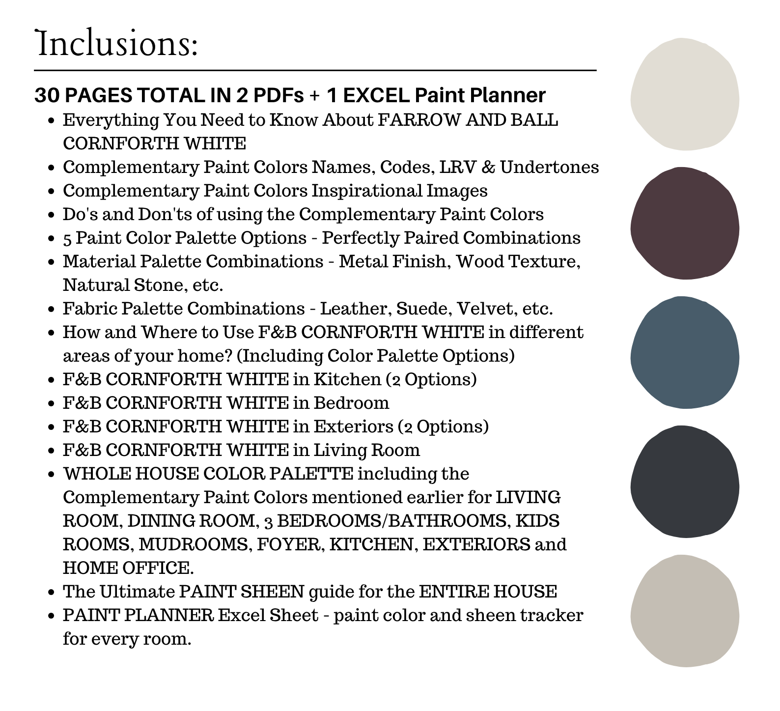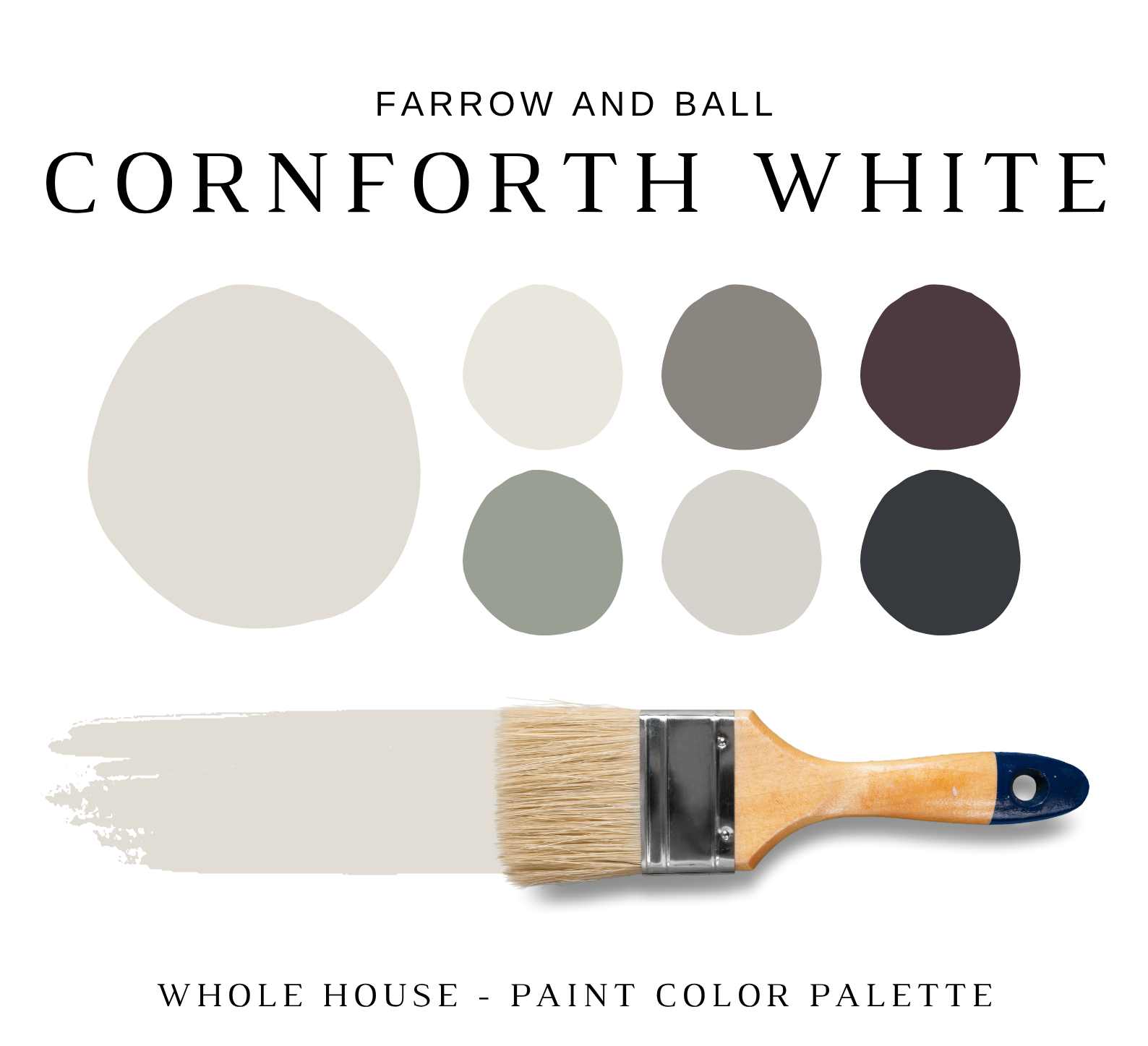 This is a *digital download* Farrow and Ball CORNFORTH WHITE Color Palette PDF that contains 30 pages total of information to assist you with quick and easy color selections in your home.