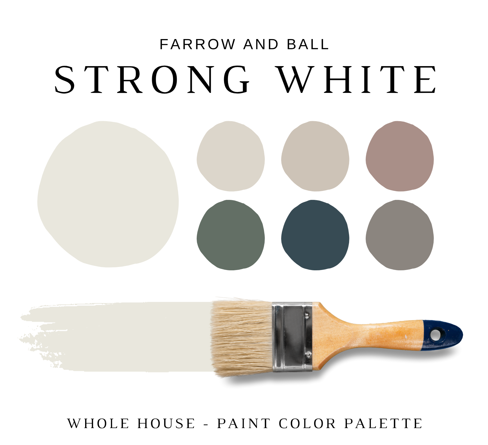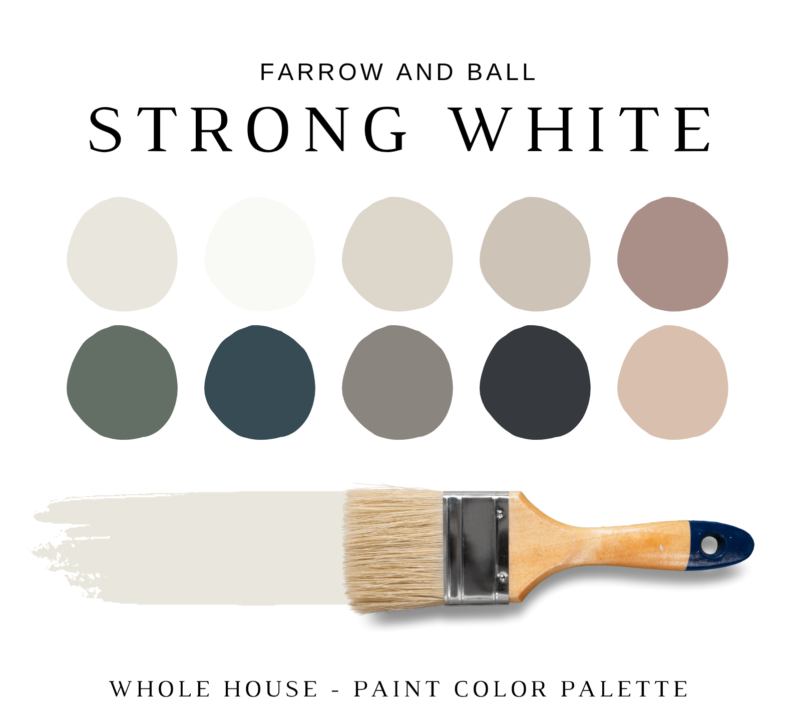 The PDF contains EVERYTHING you need to KNOW about Farrow and Ball STRONG WHITE! It includes a list of complementary Farrow and Ball Paint Colors that can be used to pair with Farrow and Ball STRONG WHITE. This is a PREPACKAGED Color Palette Selection Listing that includes the Farrow and Ball STRONG WHITE color recommendations for walls, ceilings, trims, moldings, doors, and window frames – for your WHOLE HOUSE.