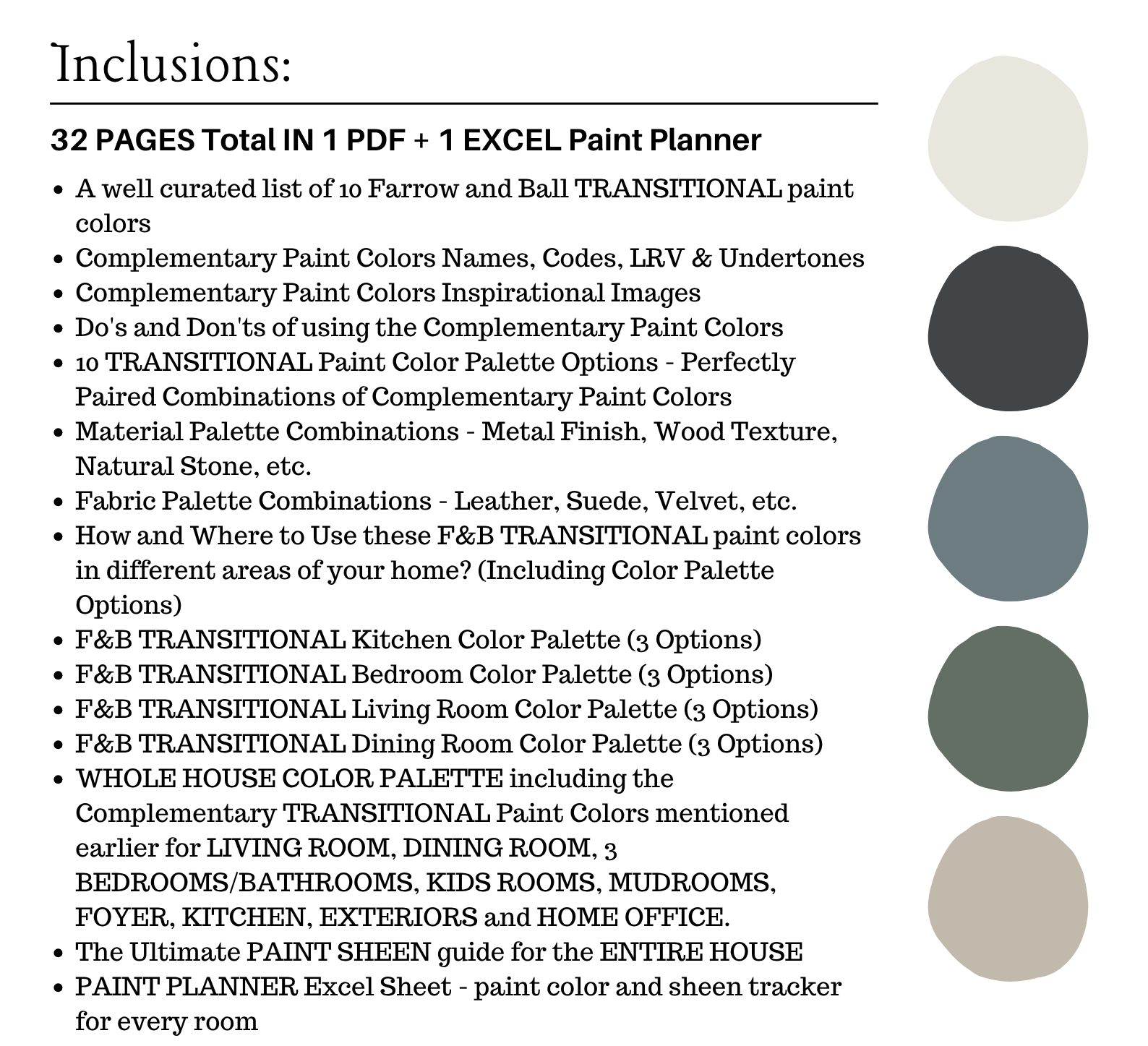 The PDF contains EVERYTHING you need to KNOW about Farrow and Ball TRANSITIONAL Color Palette! It includes a list of 10 complementary Farrow and Ball TRANSITIONAL Paint Colors that complement each other. This is a PREPACKAGED Farrow and Ball TRANSITIONAL Color Palette Selection Listing that includes the Farrow and Ball complementary color recommendations for walls, ceilings, trims, moldings, doors, and window frames – for your WHOLE HOUSE.