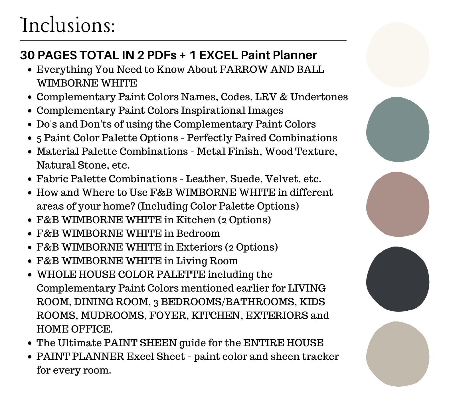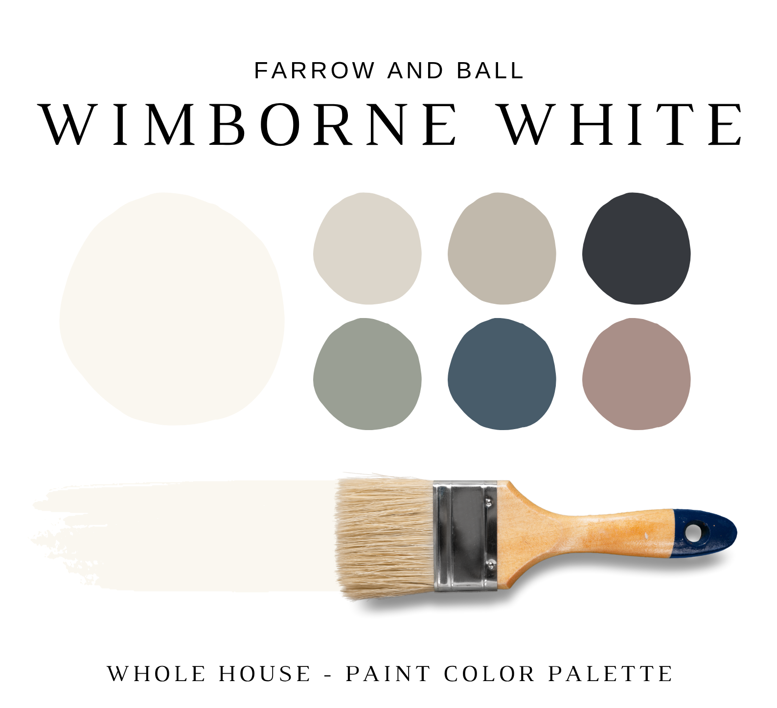 The PDF contains EVERYTHING you need to KNOW about Farrow and Ball WIMBORNE WHITE! It includes a list of complementary Farrow and Ball Paint Colors that can be used to pair with Farrow and Ball WIMBORNE WHITE. This is a PREPACKAGED Color Palette Selection Listing that includes the Farrow and Ball WIMBORNE WHITE color recommendations for walls, ceilings, trims, moldings, doors, and window frames – for your WHOLE HOUSE.