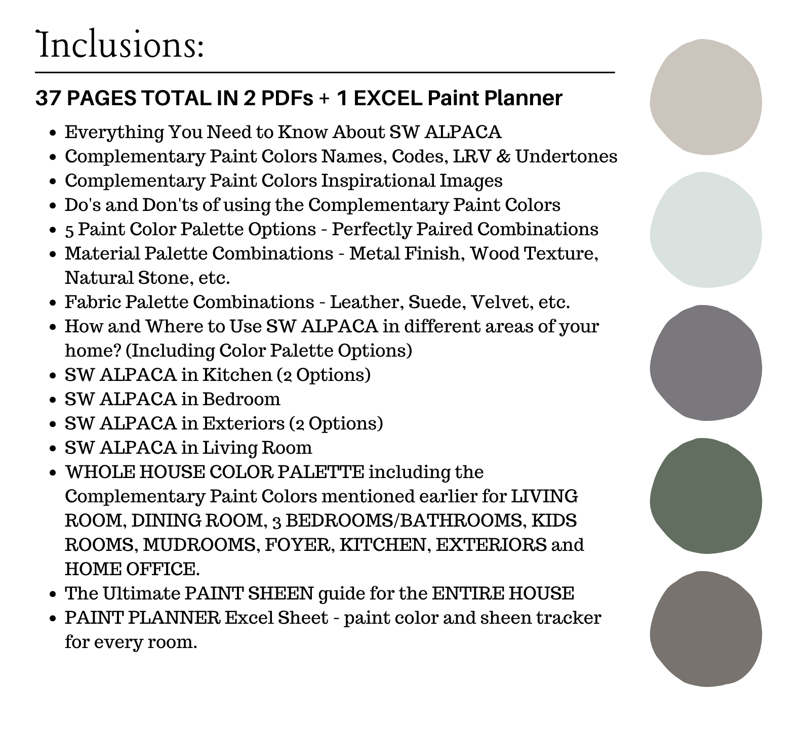The PDF contains EVERYTHING you need to KNOW about Sherwin Williams ALPACA! It includes a list of complementary Sherwin Williams Paint Colors that can be used to pair with SW ALPACA. This is a PREPACKAGED Color Palette Selection Listing that includes the Sherwin Williams ALPACA color recommendations for walls, ceilings, trims, moldings, doors, and window frames – for your WHOLE HOUSE.