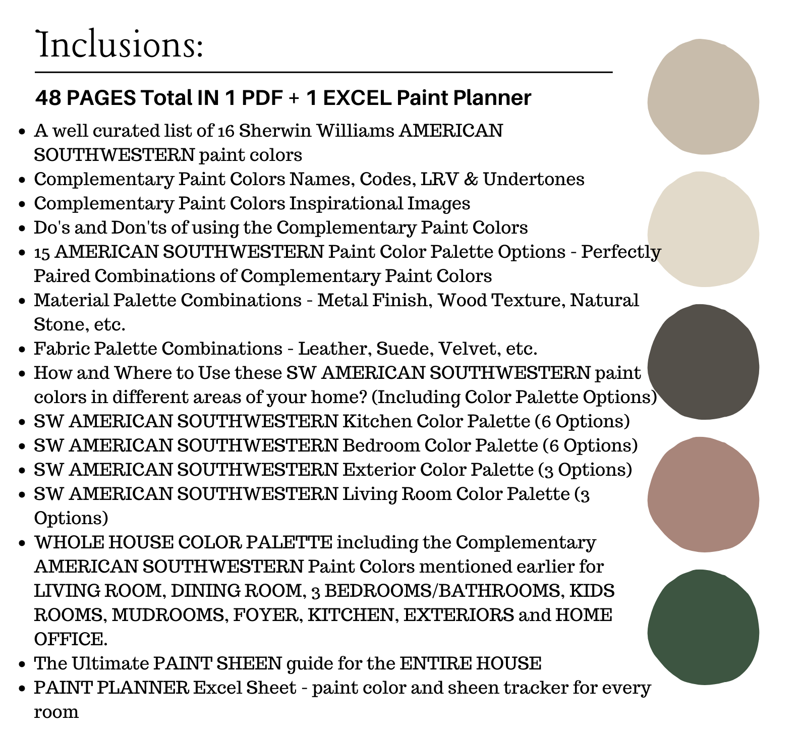 The PDF contains EVERYTHING you need to KNOW about Sherwin Williams AMERICAN SOUTHWEST Color Palette! It includes a list of 16 complementary Sherwin Williams AMERICAN SOUTHWEST Paint Colors that complement each other. This is a PREPACKAGED Sherwin Williams AMERICAN SOUTHWEST Color Palette Selection Listing that includes the Sherwin Williams complementary color recommendations for walls, ceilings, trims, moldings, doors, and window frames – for your WHOLE HOUSE.