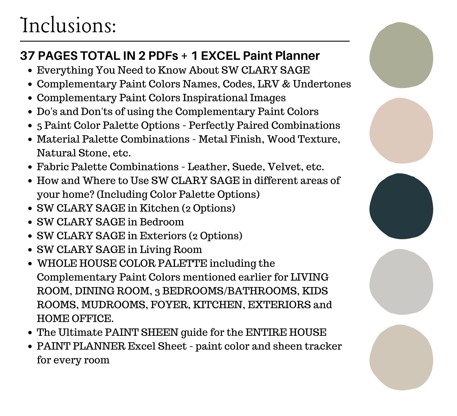 The PDF contains EVERYTHING you need to KNOW about Sherwin Williams CLARY SAGE! It includes a list of complementary Sherwin Williams Paint Colors that can be used to pair with Sherwin Williams CLARY SAGE. This is a PREPACKAGED Color Palette Selection Listing that includes the Sherwin Williams CLARY SAGE color recommendations for walls, ceilings, trims, moldings, doors, and window frames – for your WHOLE HOUSE. It also includes the material color palette (satin brass, matte black, polished chrome, wood stains, or copper that resonates with the color palette) and fabric color palette (color and material of the fabric on the furniture).