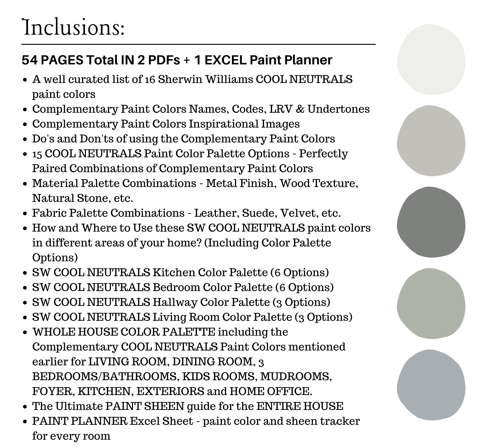 The PDF contains EVERYTHING you need to KNOW about Sherwin Williams COOL NEUTRALS Color Palette! It includes a list of 16 complementary Sherwin Williams COOL NEUTRALS Paint Colors that complement each other. This is a PREPACKAGED Sherwin Williams COOL NEUTRALS Color Palette Selection Listing that includes the Sherwin Williams complementary color recommendations for walls, ceilings, trims, moldings, doors, and window frames – for your WHOLE HOUSE.