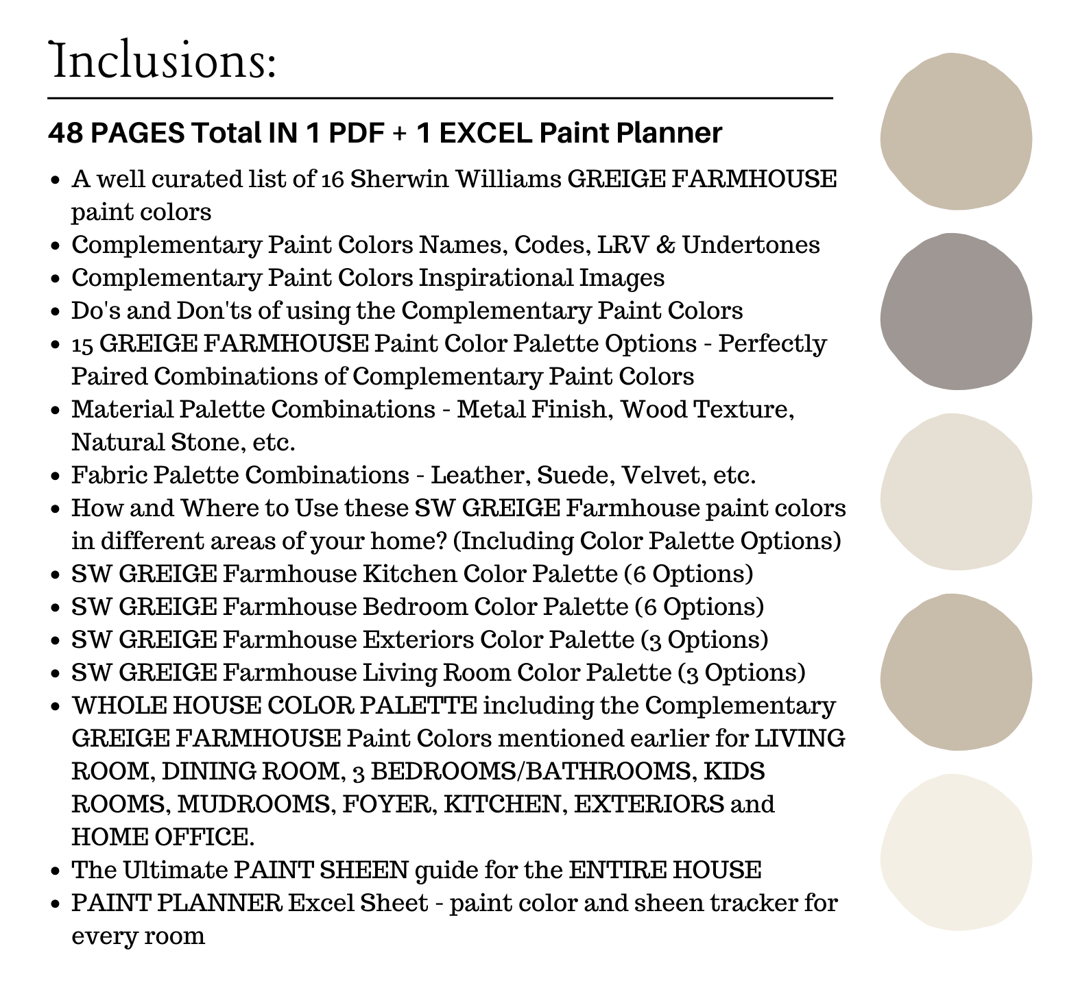 The PDF contains EVERYTHING you need to KNOW about Sherwin Williams GREIGE FARMHOUSE Color Palette! It includes a list of 16 complementary Sherwin Williams GREIGE FARMHOUSE Paint Colors that complement each other. This is a PREPACKAGED Sherwin Williams GREIGE FARMHOUSE Color Palette Selection Listing that includes the Sherwin Williams complementary color recommendations for walls, ceilings, trims, moldings, doors, and window frames – for your WHOLE HOUSE.