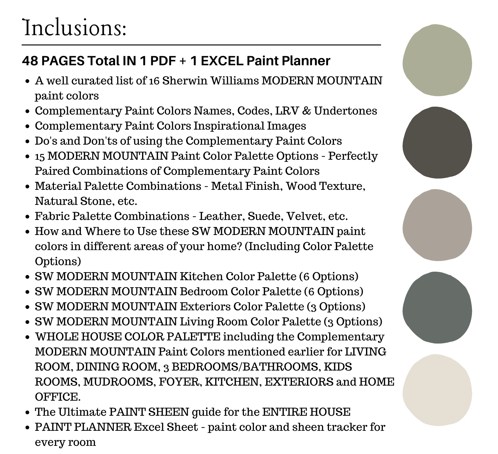 The PDF contains EVERYTHING you need to KNOW about Sherwin Williams MODERN MOUNTAIN Color Palette! It includes a list of 16 complementary Sherwin Williams MODERN MOUNTAIN Paint Colors that complement each other. This is a PREPACKAGED Sherwin Williams MODERN MOUNTAIN Color Palette Selection Listing that includes the Sherwin Williams complementary color recommendations for walls, ceilings, trims, moldings, doors, and window frames – for your WHOLE HOUSE.