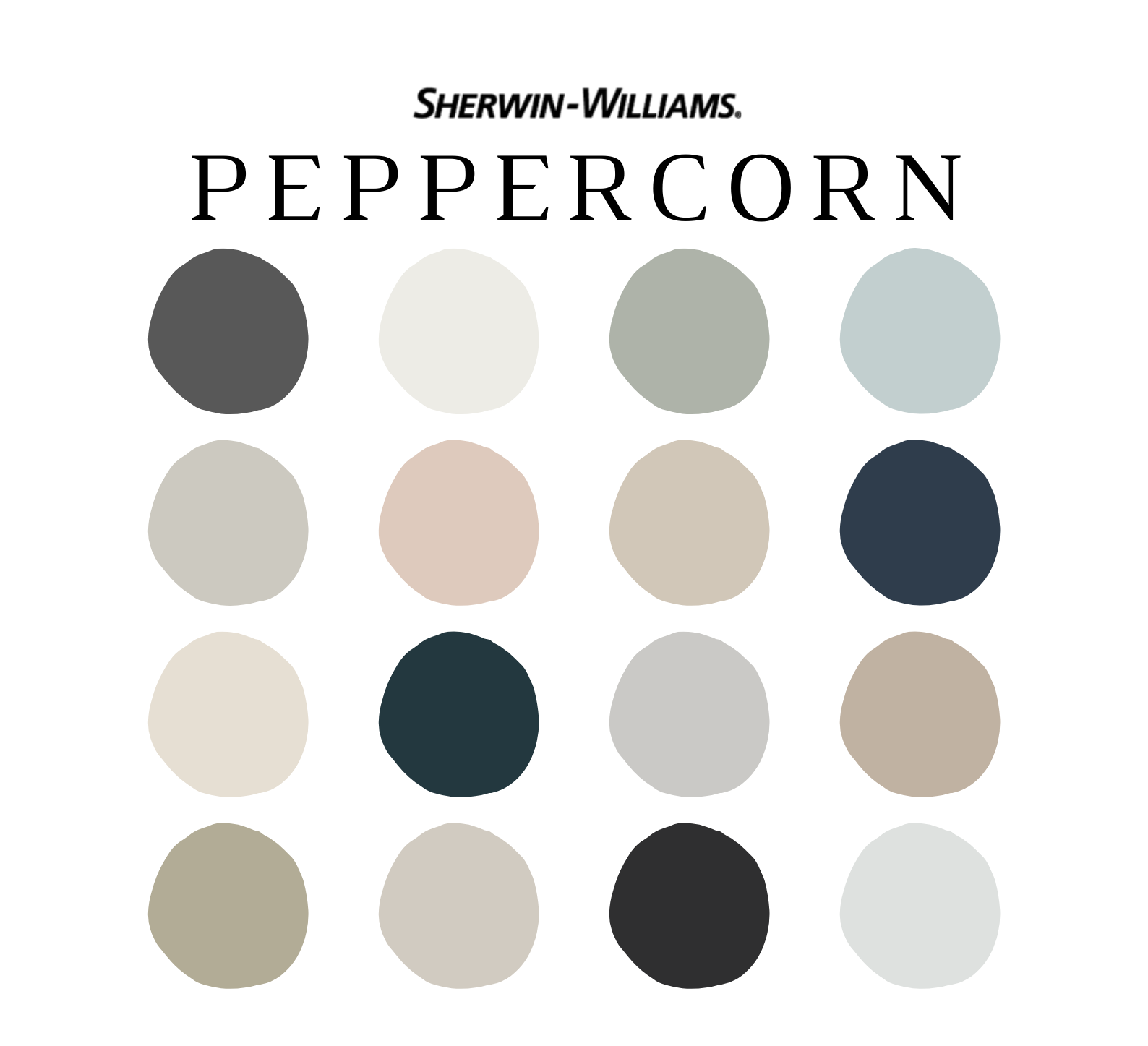 This is a *digital download* Sherwin Williams PEPPERCORN Color Palette PDF that contains 36 pages total of information to assist you with quick and easy color selections in your home.