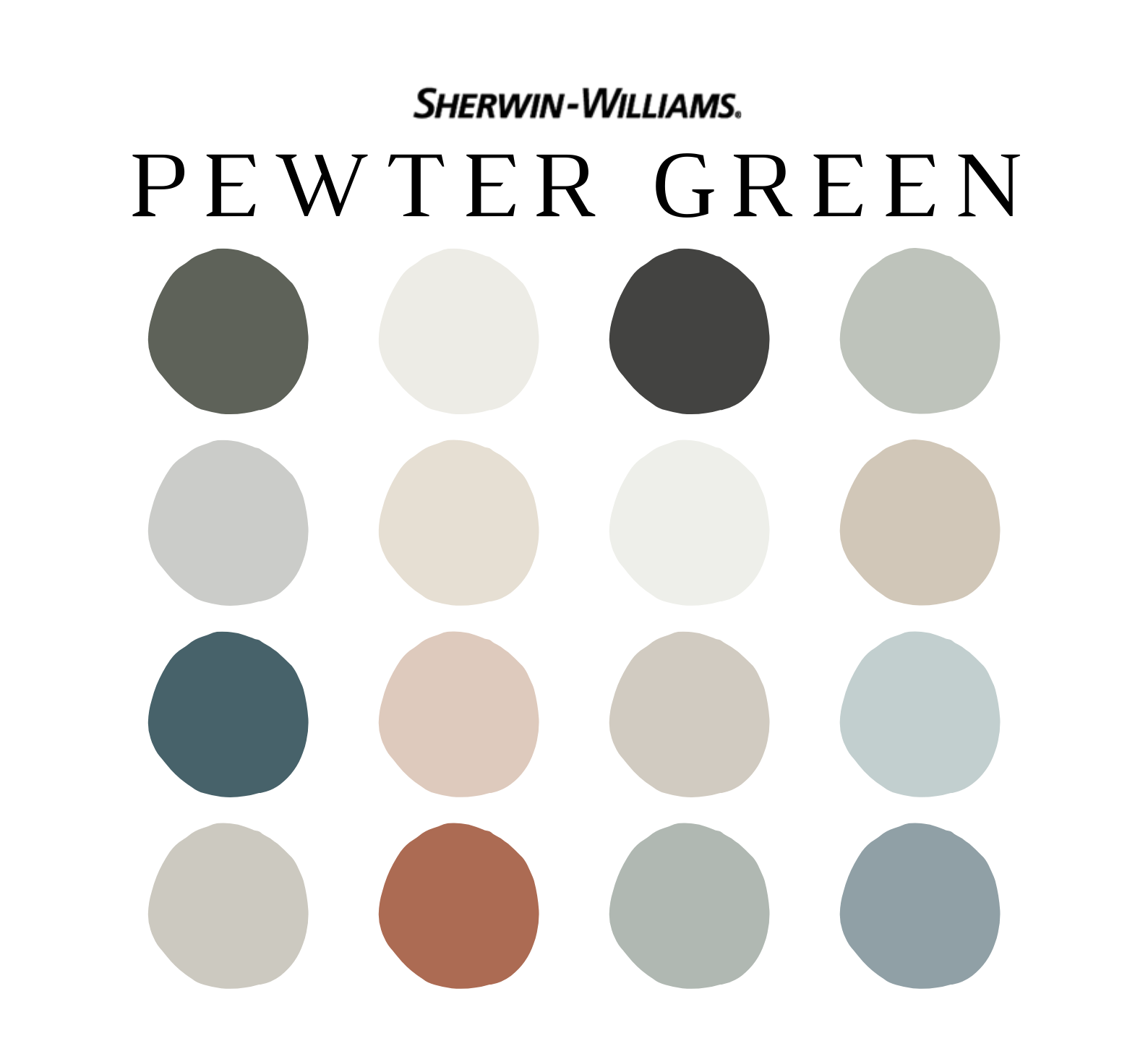 This is a *digital download* Sherwin Williams PEWTER GREEN Color Palette PDF that contains 36 pages total of information to assist you with quick and easy color selections in your home.