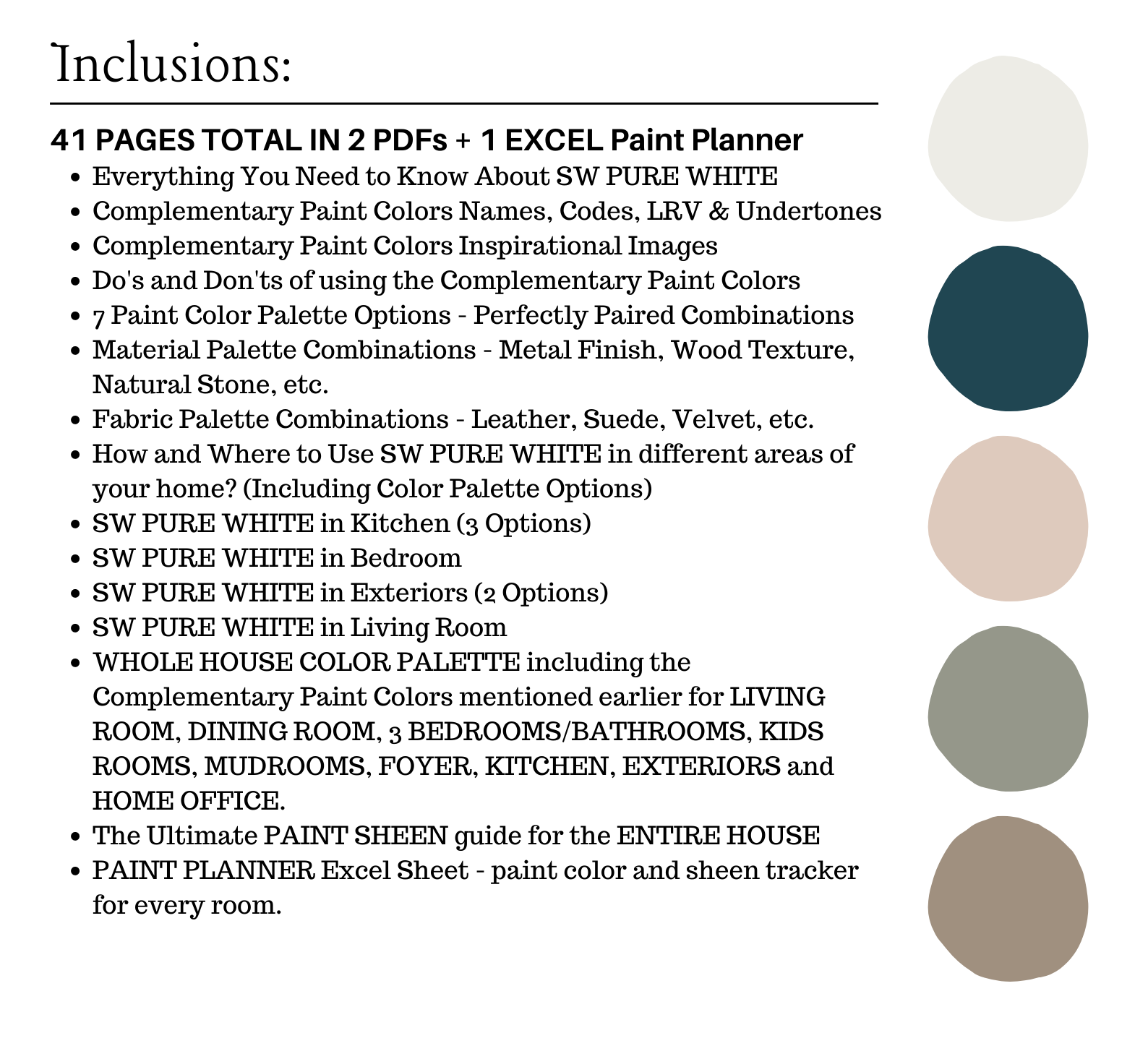 This is a *digital download* Sherwin Williams Pure White Color Palette PDF that contains 38 pages total of information to assist you with quick and easy color selections in your home.