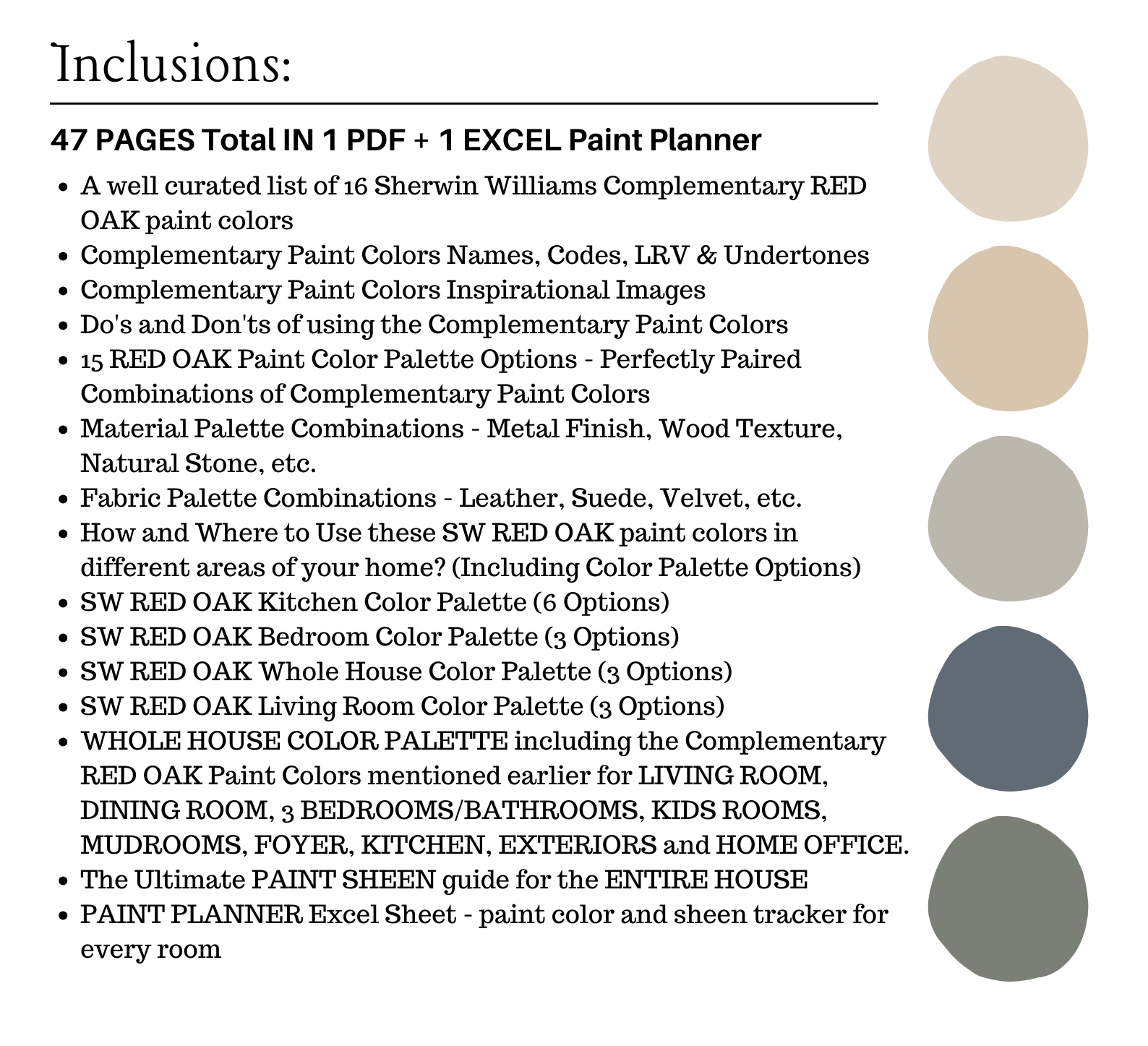 The PDF contains EVERYTHING you need to KNOW about Sherwin Williams Paint Colors that complement RED OAK, MAPLE, CHERRY, and MAHOGANY flooring and cabinets! It includes a list of 16 complementary Sherwin Williams RED OAK Paint Colors that complement each other and work as a WHOLE house color scheme. This is a PREPACKAGED Sherwin Williams RED HARDWOOD Color Palette Selection Listing that includes the Sherwin Williams complementary color recommendations for walls, ceilings, trims, moldings, doors, and window frames – for your WHOLE HOUSE.