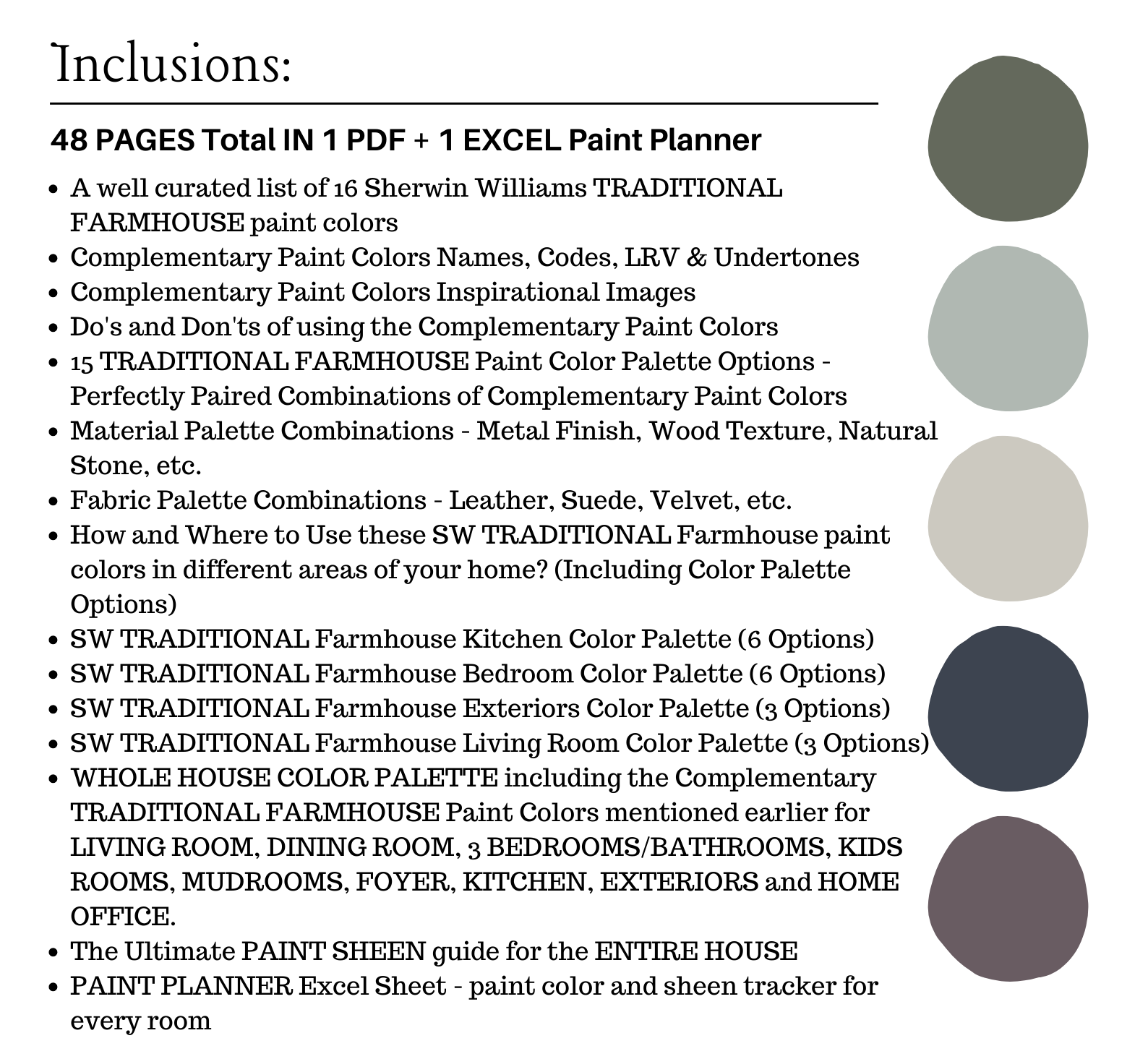 The PDF contains EVERYTHING you need to KNOW about Sherwin Williams TRADITIONAL FARMHOUSE Color Palette! It includes a list of 16 complementary Sherwin Williams TRADITIONAL FARMHOUSE Paint Colors that complement each other. This is a PREPACKAGED Sherwin Williams TRADITIONAL FARMHOUSE Color Palette Selection Listing that includes the Sherwin Williams complementary color recommendations for walls, ceilings, trims, moldings, doors, and window frames – for your WHOLE HOUSE.