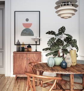 You will often find lighter fabrics and furniture styles similar to those of mid-century modern that continually focus on functionality and geometric shapes.