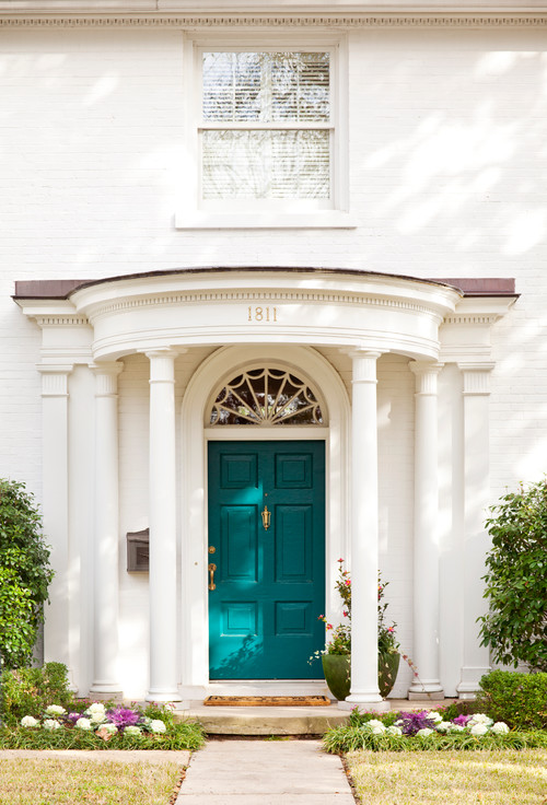 This teal front door color can best pair with an all-white exterior color palette, light gray walls, and beige stucco textures. I wouldn’t even mind pairing this scratch teal green color with your black exterior walls.