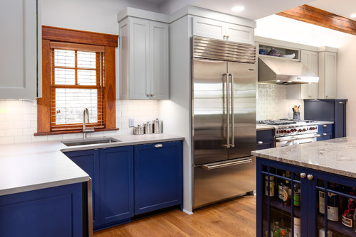 For a touch of elegance and richness, try using satin brass hardware for the navy cabinets; else you can even choose polished chrome or matte black.
